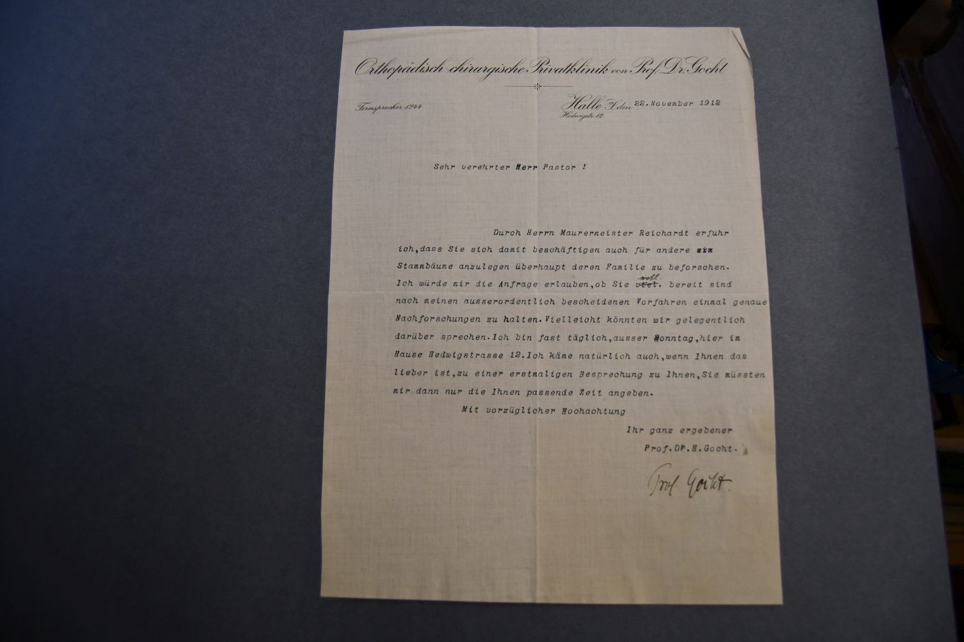 Einseitiger, unterschriebener, maschinenschriftlicher Brief des deutschen Orthopäden und Hochschullehrers Hermann Gocht (1869-1938) an einen namentlich nicht genannten Pastor vom 22. November 1912 auf dem gedruckten Briefkopf der orthopädisch-chirurgischen Privatklinik von Prof. Dr. Gocht.