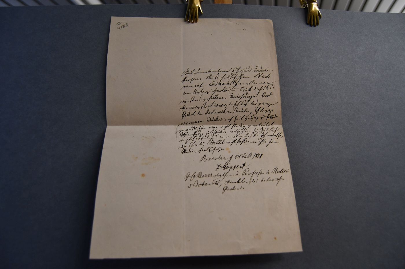 Handschriftliche Studienbescheinigung des deutschen Botanikers Johann Heinrich Robert Göppert (1800-1884) für Stud. rer. nat Lakowitz vom 28. Juli 1871.