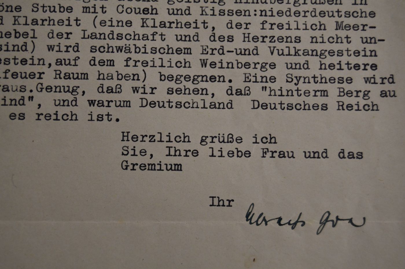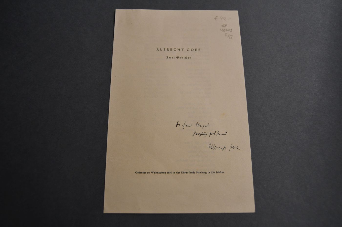 3 einseitige, unterschriebene maschinenschriftliche Briefe und ein handschriftlich gewidmeter Sonderdruck von Albrecht Goes (1908-2000) an den Pädagogen Dr. Emil Wezel (1905-1984) vom 19.8.1939, 25.2.1940 und vom 16.3. o.J.