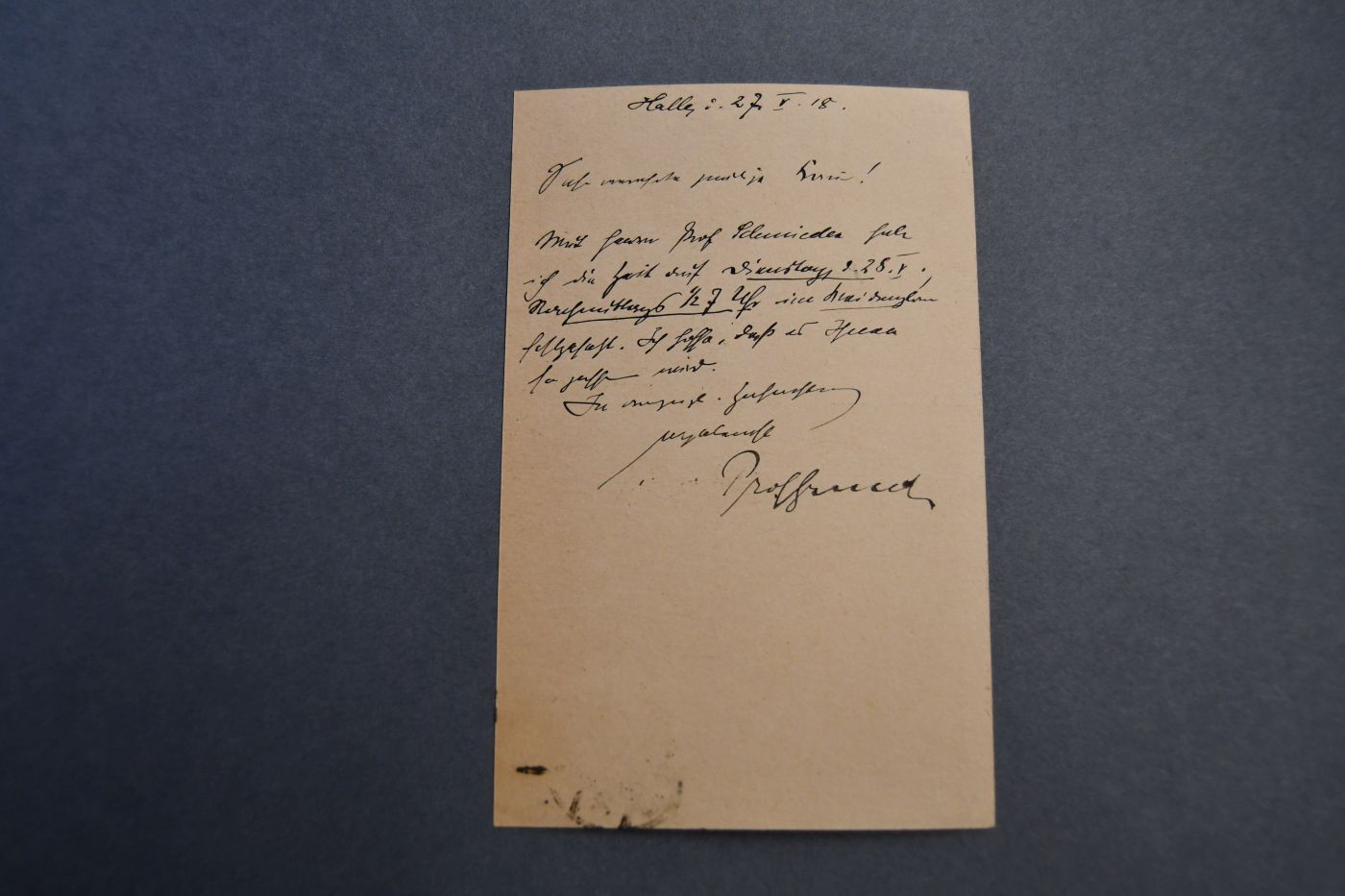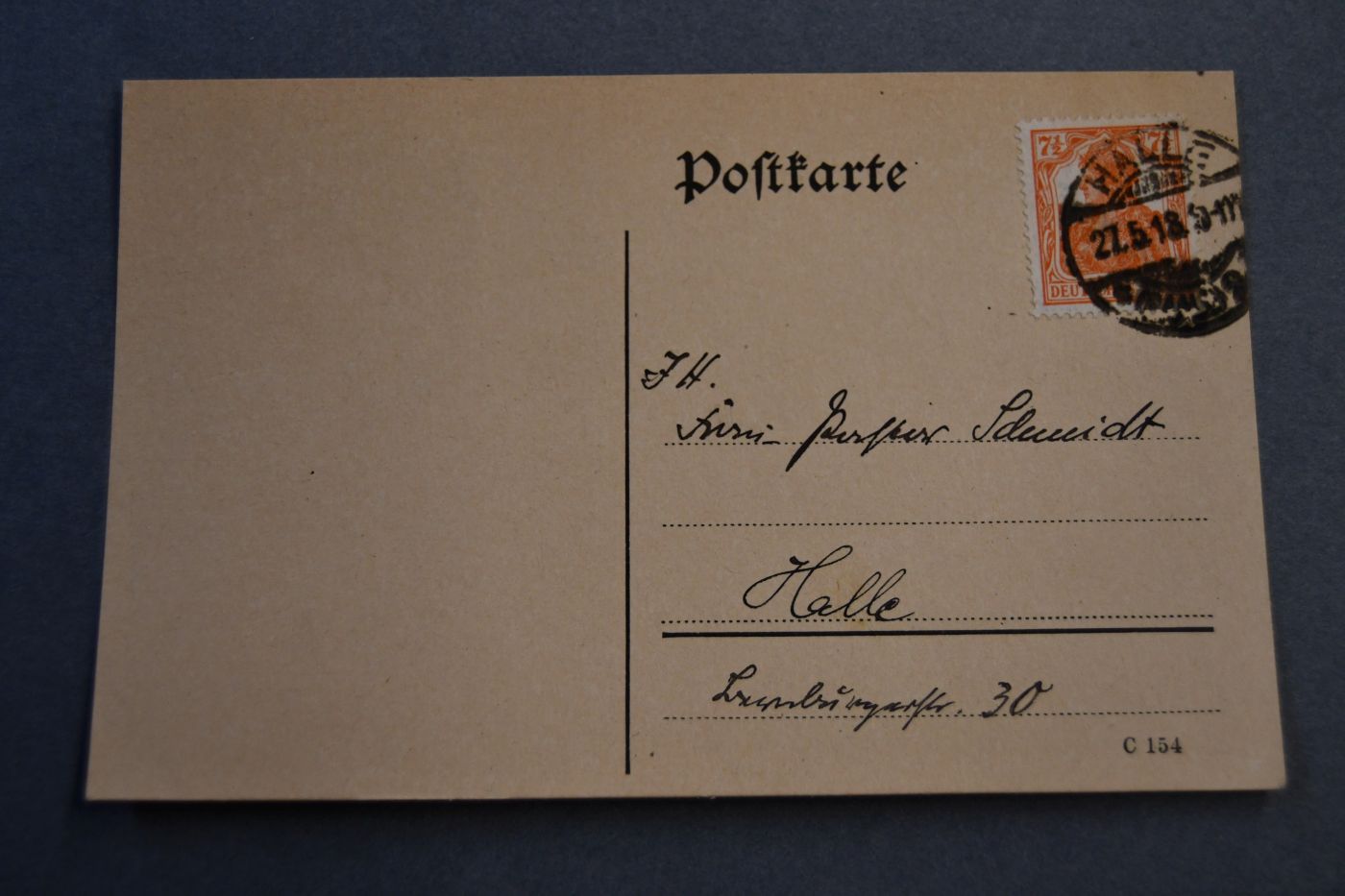 Handschriftliche Postkarte des Professors für Innere Medizin in Halle an Frau Pastor Schmidt in Halle vom 27. Mai 1918.