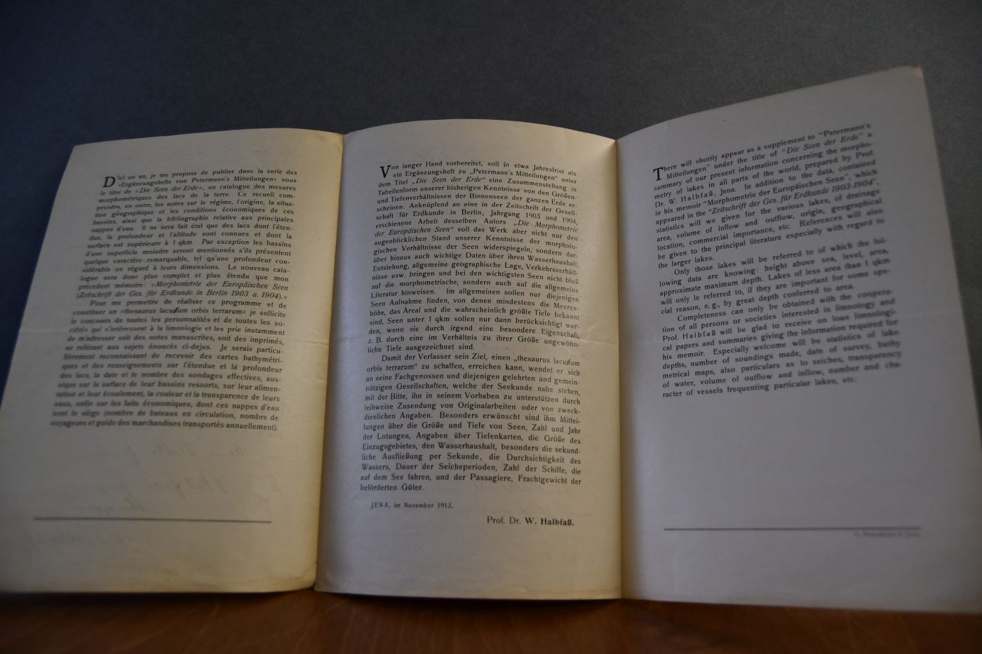Format 23 x 15 cm, dreifach gefaltetes Blatt mit mehrsprachig gedruckter Bitte um Mithilfe bei einer tabellarischen Zusammenstellung zu den Daten der Seen der Welt