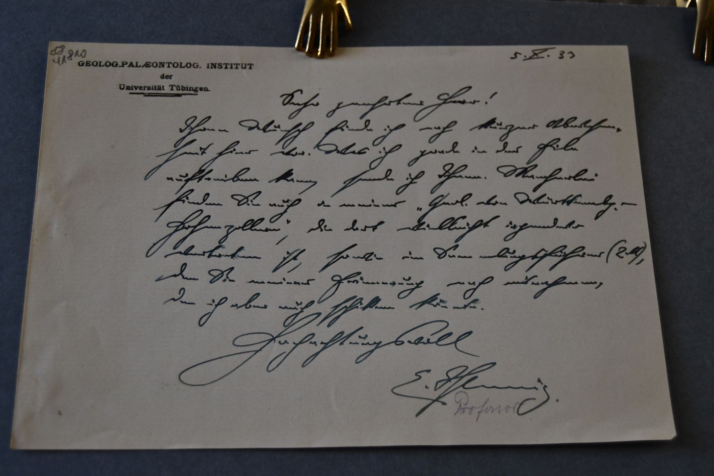 Handschriftlicher Brief des Tübinger Paläontologen Edwin Hennig (1882-1977) vom 5. Oktober 1933 an den Danziger Lehrer und Botaniker Konrad Lakowitz (1859-1938).