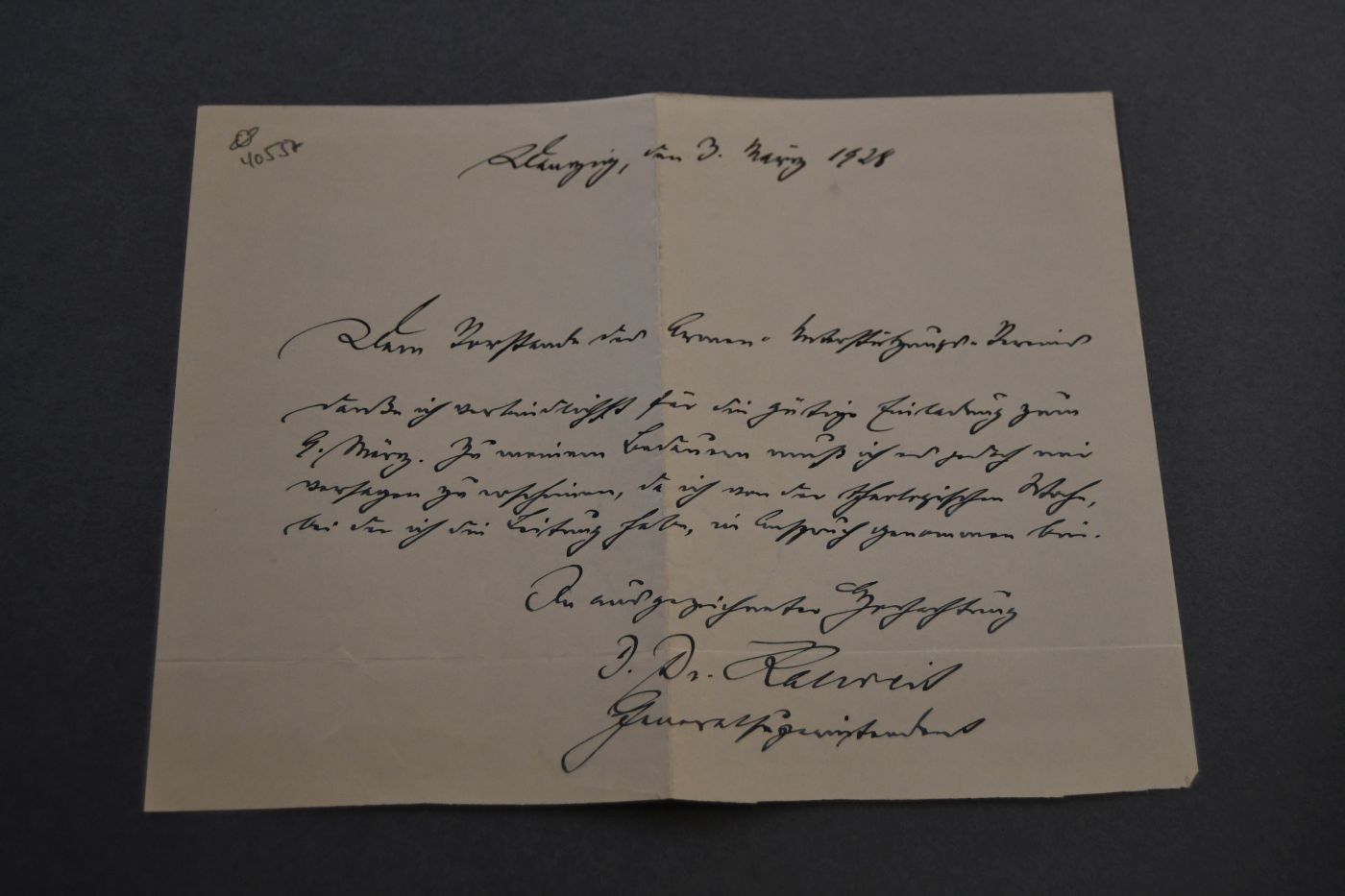Beschreibung Durchgehender Längs- und Querfalz. 1-seitiger handschriftlicher Brief von Superintendenten Paul Kalweit an den Vorstand des Danziger Armen-Unterstützungs-Verein in dem er um seine Entschuldigung wegen der Nichtteilnahme an einer Veranstaltung am 9. März bittet.