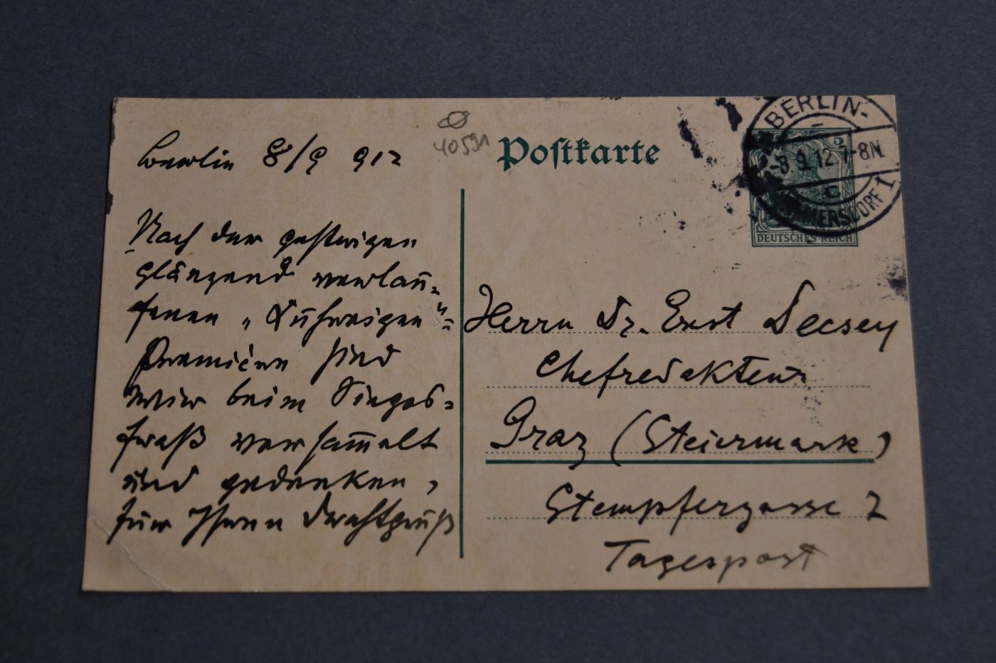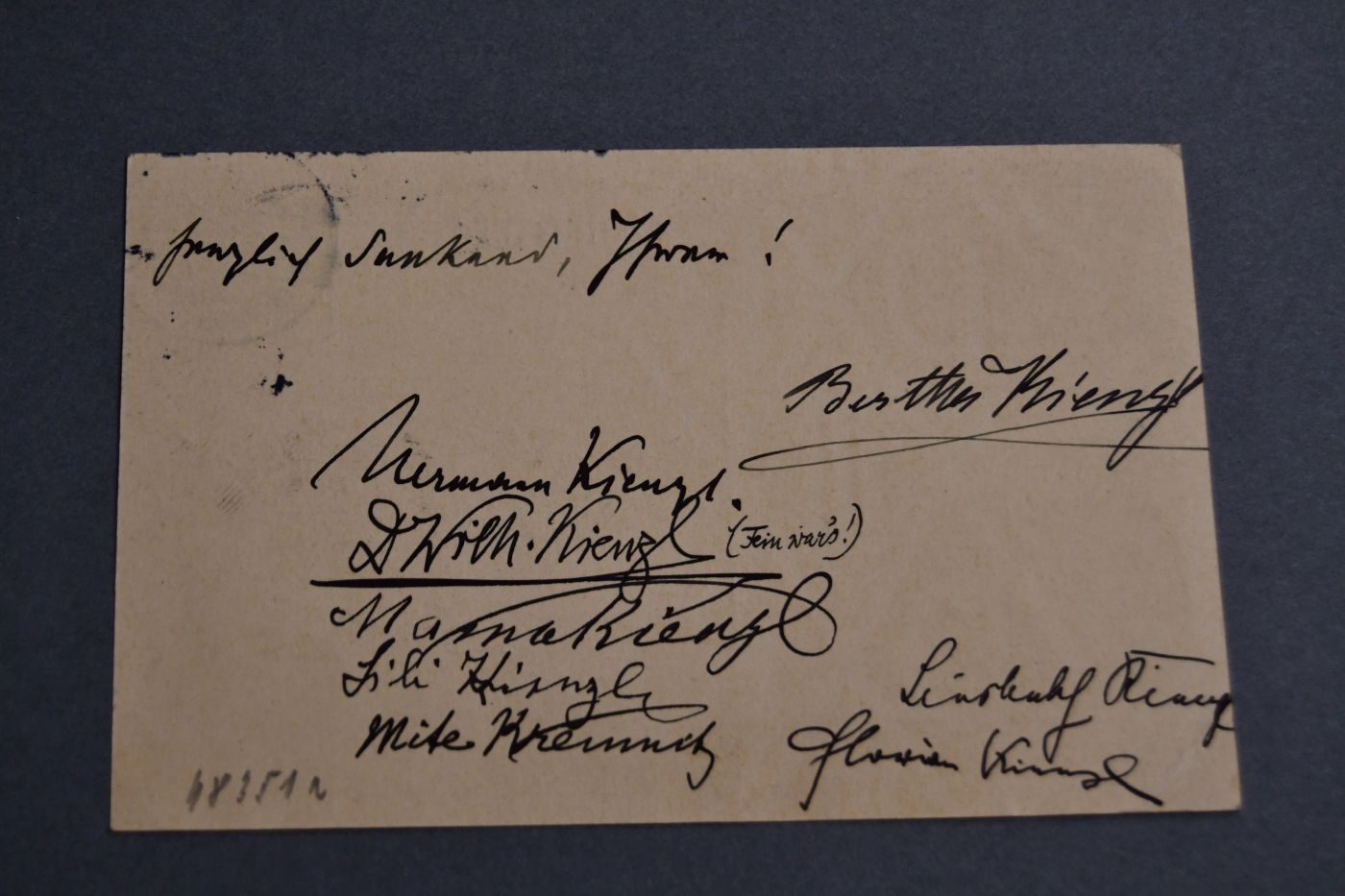 Postkarte an den Musikkritiker der Grazer Tagespost Dr. Ernst Descey mit 7 Unterschriften von Familienmitgliedern der Familie Kienzl vom 8. September 1912.