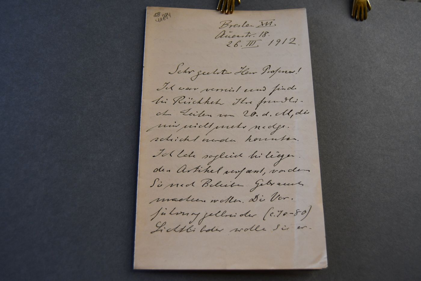 Handschriftlicher Brief des deutschen Mediziners und Anthropologen Hermann Klaatsch (1863-1916) vom 26. März 1912 an den Danziger Lehrer und Botaniker Konrad Lakowitz (1859-1938).