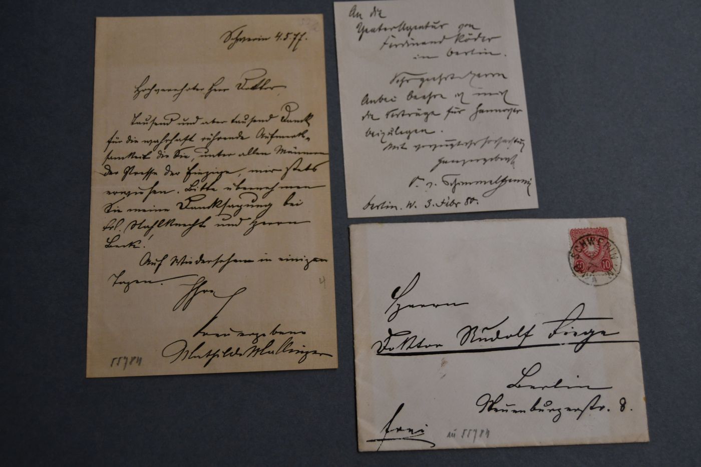 Beschreibung Durchgehender Querfalz. Mathilde Mallinger schreibt: "... Tausend und aber tausend Dank für die wahrhaft rührende Aufmerksamkeit die SIe, unter allen Männern der Presse der Einzige, mir stets erweisen. Bitte übernehmen Sie meine Danksagung bei Frl. Stahlknecht und Herrn Beck! ...". Beiliegend der mit versiegelte, handschriftliche Briefumschlag. Ebenfals beiliegend das handschriftliche Schreiben ihres Ehemanns Otto von Schimmelpfennig an die Theateragentur Ferdinand Röder in Berlin vom 3. Februar 1880 (Ferdinand Röder starb am 30. Juni 1880!): "... Anbei beehre ich mich die Verträge für Hannover beizulegen. ...".