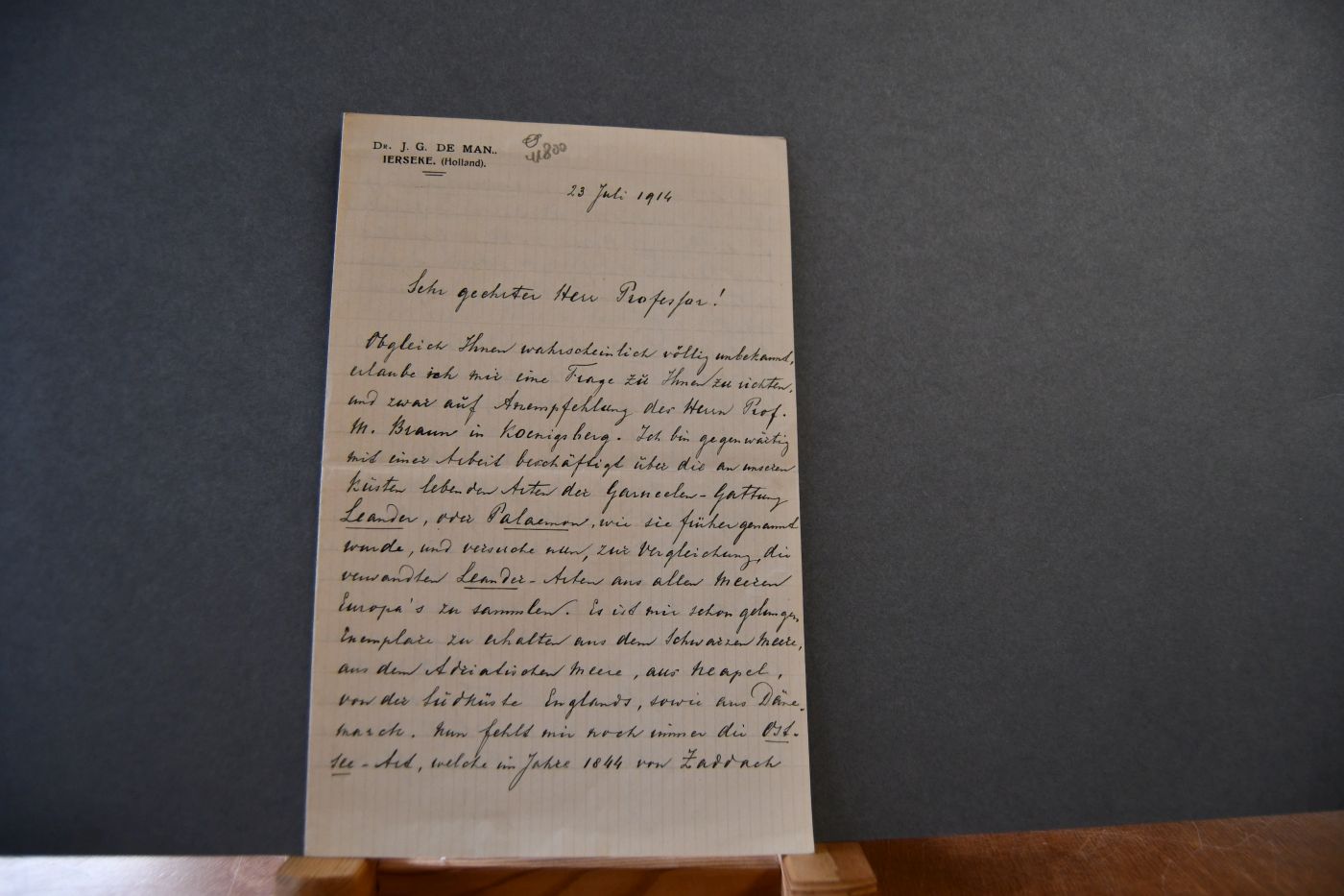 Handschriftlicher Brief des niederländischen Biologen Johannes Govertus de Man (1850-1930) an den Danziger Lehrer und Botaniker Konrad Lakowitz (1859-1945) vom 23. Juli 1914.