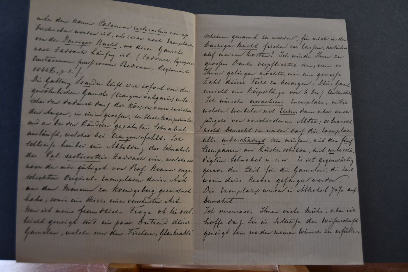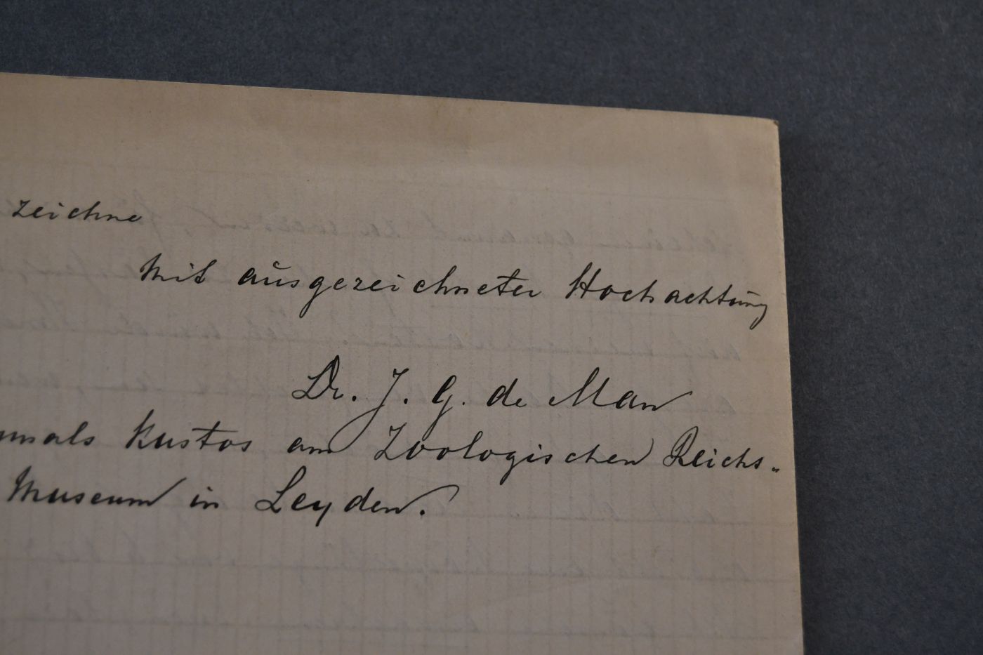 Beschreibung Berieben. 3 1/2-seitiger handschriftlicher Brief von Johannes Govertus de Man vom 23.7.1914. De Man bittet Konrad Lakowitz ihm Glaskrabben, wie sie von Zaddach in der Danziger Bucht beschrieben wurden, zuzusenden. Beiliegend eine Zeichnung mit den Erkennungsmerkmalen der gewünschten Art.