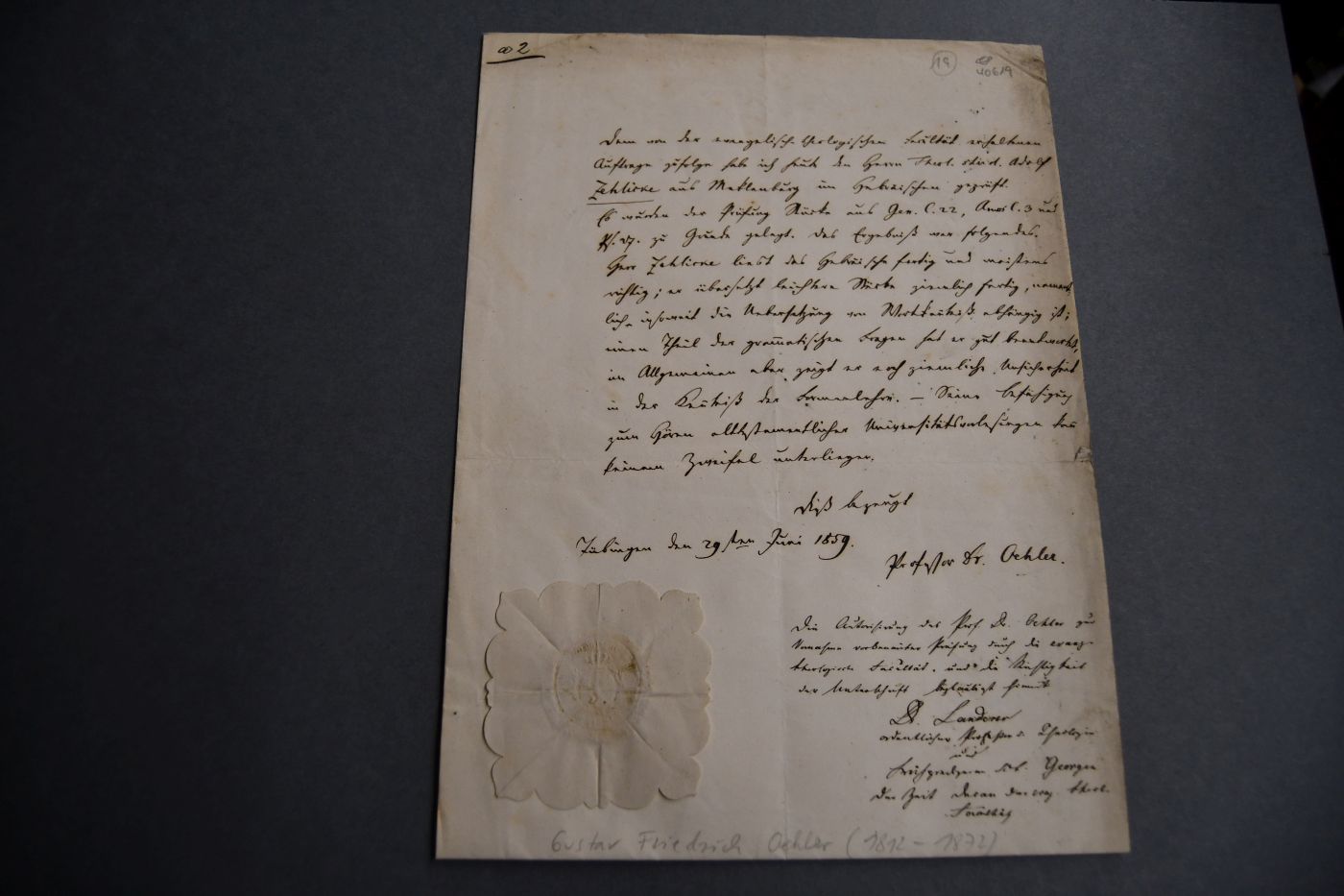 Zeugnis der Theologischen Fakultät der Eberhard-Karls-Universität Tübingen. Geschrieben und signiert von Gustav Friedrich Oehler (1812-1872). Geprüft wurde der Theologe und Journalist Adolf Zehlike (1834-1904), dem ziemliche Unsicherheit in der Formenlehre bestätigt wurden, seine Befähigung zum Hören alttestamentlicher Vorlesungen köönne aber keinem Zweifel unterliegen. Die Berechtigung Oehlers zur Prüfungsabnahme und die Echtheit seiner Unterschrift werden vom damaligen Dekan der Theologischen Fakultät Albert Landerer (1810-1878) bestätigt.