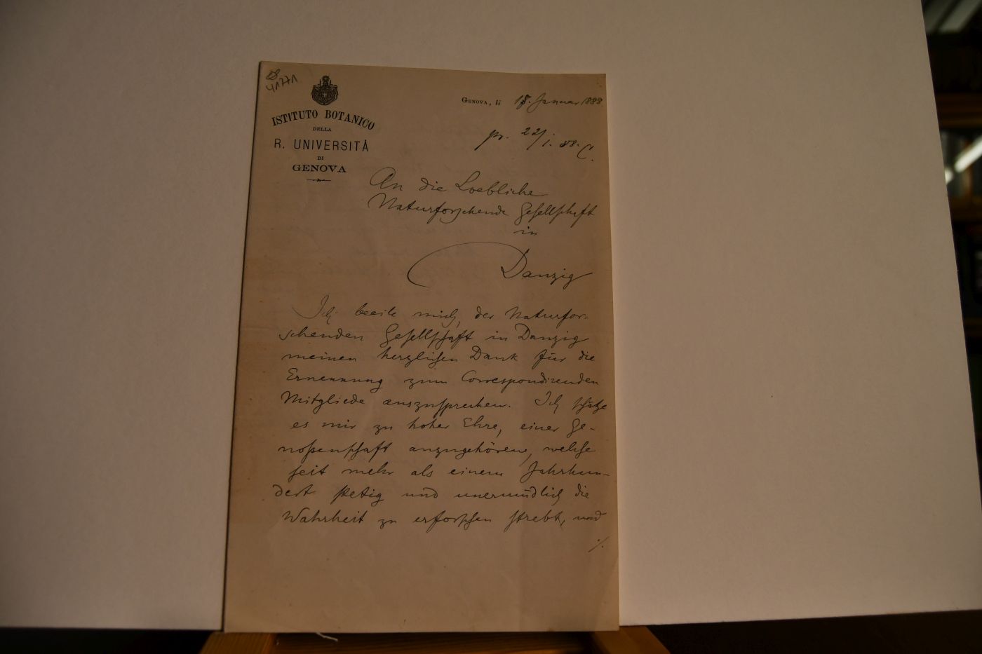 Beschreibung Zweiseitiges handschriftliches Schreiben vom 18.1.1888. Eingedruckter Briefkopf des Istituto Botanico della R. Universita di Genova. Penzig bedankt sich für die Ernennung zum correspondierenden Mitglied der Naturforschenden Gesellschaft in Danzig..