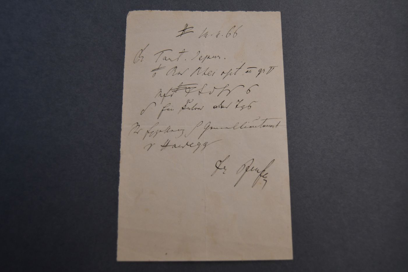 Handschriftliches Rezept des Münchner Mediziners und Hochschullehrers Karl Sebastian von Pfeufer (1806 - 1869) für den württembergischen Generallieutenant Oskar (oder Julius?) von Hardegg (1810 - 1875) vom 3.2.1866.