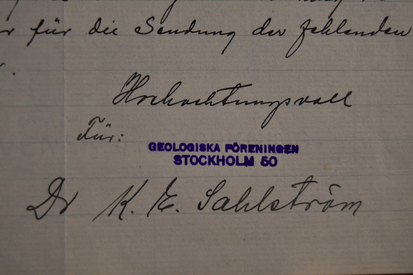 Handschriftlicher Brief des schwedischen Geologen und Archäologen Karl Esaias Sahlström (1884-1964) an die Naturforschende Gesellschaft in Danzig vom 27. August 1923.