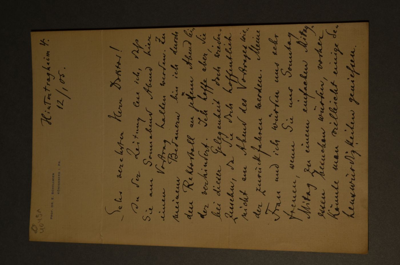 Brief von Professor Dr. Ernst Schellwien, Königsberg an den Danziger Lehrer und Botaniker Konrad Lakowitz (1859-1945) vom 4. Dezember 1905.