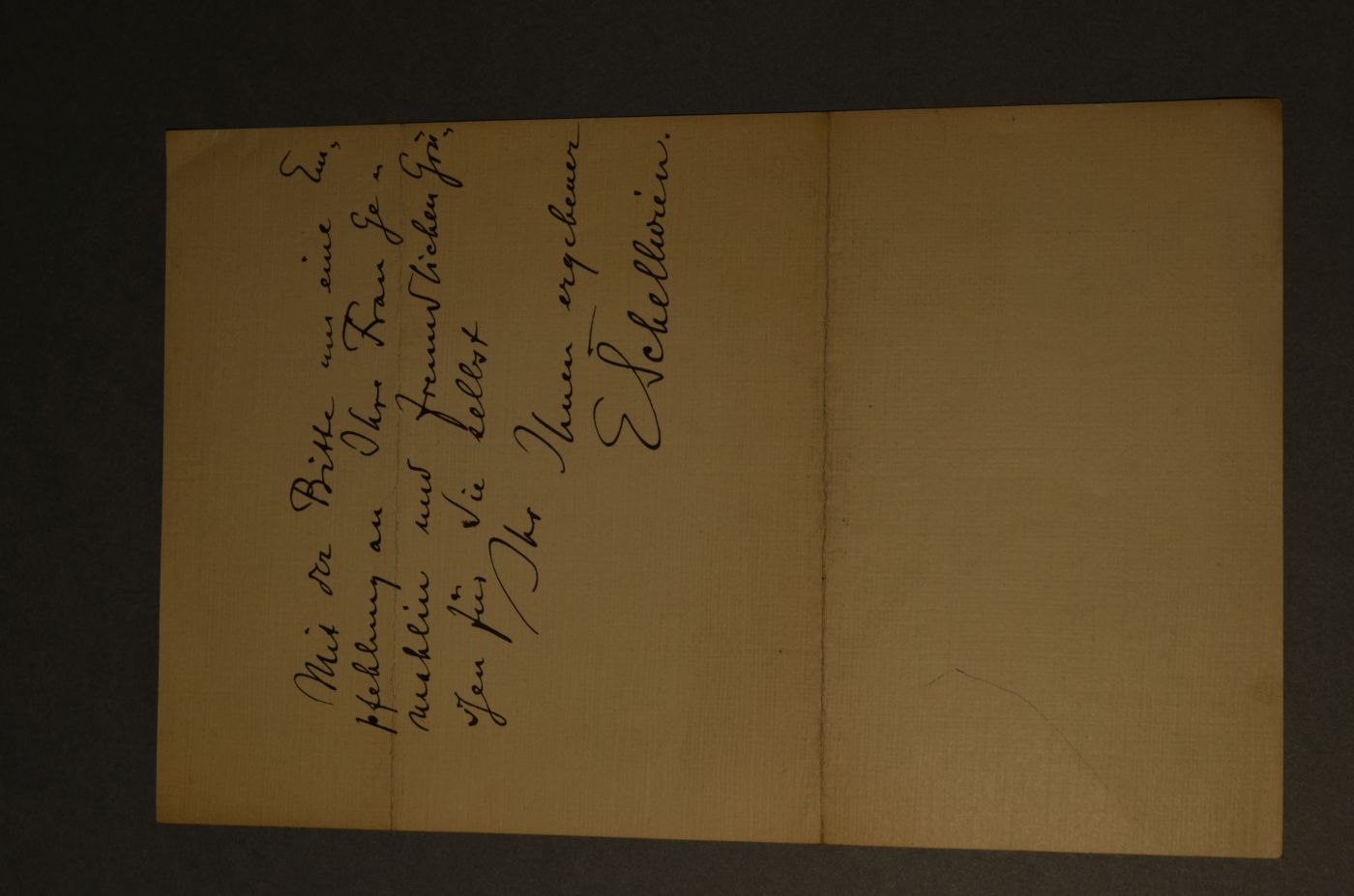Beschreibung Handschriftlicher, 1 1/2-seitiger Brief mit durchgehenden Querfalzen. Schellwien lädt Lakowitz zum Mittagessen ein, nachdem dieser am Vortag einen Vortrag in Königsberg gehalten hat.
