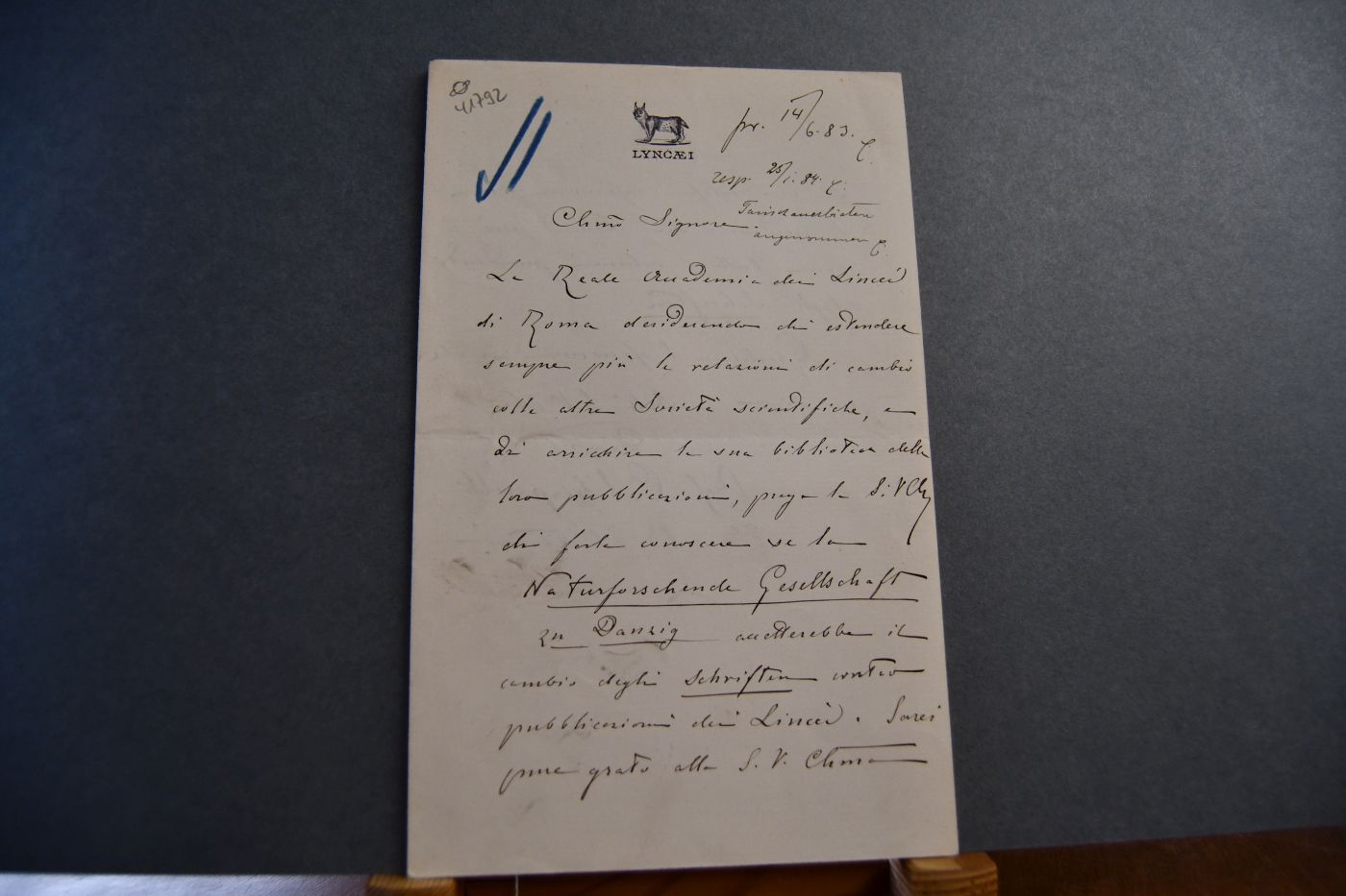 Beschreibung 1 1/2-seitiges Schreiben. Querfalz und handschriftliche Bearbeitungsvermerke. Aufgedruckter Briefkopf der Accademia Nazionale dei Lincei. Schiaparelli bittet die Naturforschende Gesellschaft Danzig als Bibliothekar der Accademia Nazionale dei Lincei um einen Schriftentausch.