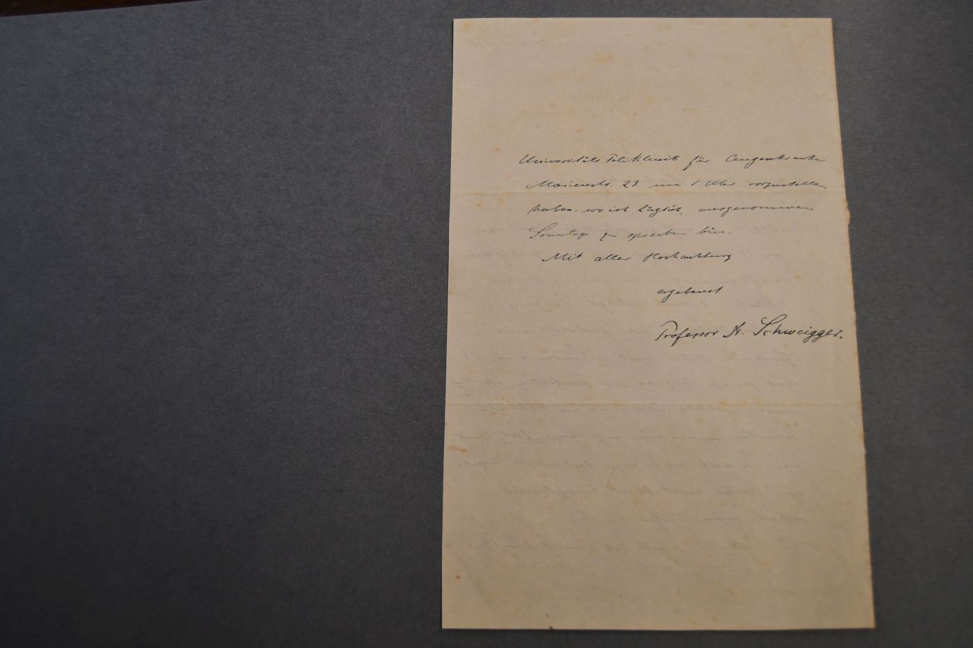 Beschreibung Fleckig und durchgehende Querfalze. Karl Schweigger teilt einer nicht benannten Person mit, dass der Verpflegungssatz in der Universitäts Augenklinik 2 Mark betrage und schildert die Möglichkeiten für minderbemittelte Personen kostenlos behandelt zu werden.
