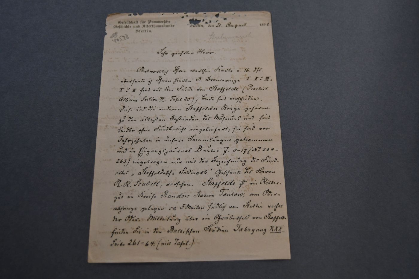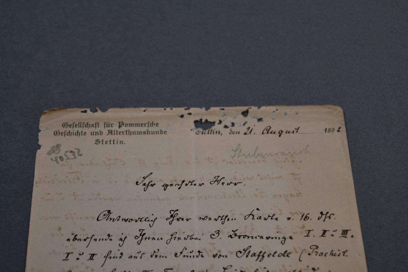 Seiten 2-seitiger Brief auf 21,7 x 14,2 cm großem Blattmit dem Briefkopf der Gesellschaft für Pommersche Geschichte und Alterthumskunde Stettin.