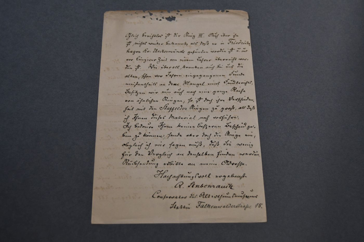 Beschreibung Berieben und bestoßen. Durchgehende Quer- und Längsfalze. Silberfischchenfraß am oberen Rand. Stubenrauch übersendet 3 Bronzeringe: "...übersende ich Ihnen hierbei 3 Bronzeringe I. II u. III. I u. II sind aus dem Funde von Staffelde (Praehist. Album Section III Tafel 20); beide sind verschieden. Diese und die anderen Staffelder Ringe gehören zu den ältesten Beständen des Museums und sind vor Jahrzehnten in unsere Sammlungen gekommen und im Eingangsjournal B unter J. 8-17 (No. 254-23) eingetragen nur mit der Bezeichnung des Fundortes "Staffeldesch Feldmark" Geschenk des Herrn R.R. Scabell, versehen. ... Gleich berichtlos ist der Ring III. Auch über ihn ist nichts weiter bekannt, als daß er in Friedrichshagen Kr. Ueckermünde gefunden worden ist u. uns vor längerer Zeit von einem Lehrer überreicht worden ist. Wie überall, kranken auch bei uns die alten, schon vor Jahren eingegangenen Funde meistentheils an dem Mangel eines Fundberichts. Besitzen wir nun auch noch eine ganze Reihe von ähnlichen Ringen, so ist doch ihre Verschiedenheit mit den Staffelder Ringen zu groß, als daß ich Ihnen dieses Material noch vorführe. Ich bedaure Ihnen keinen besseren Bescheid geben zu können, sende aber doch die Ringe ein, obgleich ich mir sagen muß, daß Sie wenig für den Vergleich an denselben finden werden. Rücksendung erbitte ich an meine Adresse. ..."