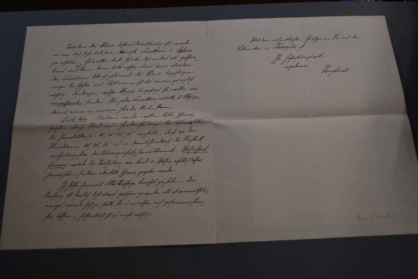 Beschreibung Durchgehende Quer- und Längsfalze. Angeschmutzt. Emil Treptow bespricht den Druck eines von ihm gehaltenen Vortrags mit der Naturforschenden Gesellschaft in Danzig: "... Trotzdem das Manu. bestens druckfertig ist, würde es mir doch sehr lieb sein, die erste Correktur in Fahnen zu erhalten. Gedrucktes liest sich doch anders als geschriebenes und ich kann dann falls nötig etwas freier abändern. ... Der Umfang ist freilich doch etwas größer geworden, als ich vermuthete; einiges würde sich ja, falls Sie es wünschen noch zusammenstreichen lassen, hoffentlich ist es nicht nöthig. ...". "... Was die Zahl der Separata betrifft, so hatte ich um 500 gebeten. Es wird Ihnen aber wohl auch recht sein, wenn ich jetzt um 550 bitte. Davon möchten 50 später an mich versendet werden, und 500 an die Cräz u. Gerlach`sche Buchhandlung (Joh. Stettner) hier. ..."