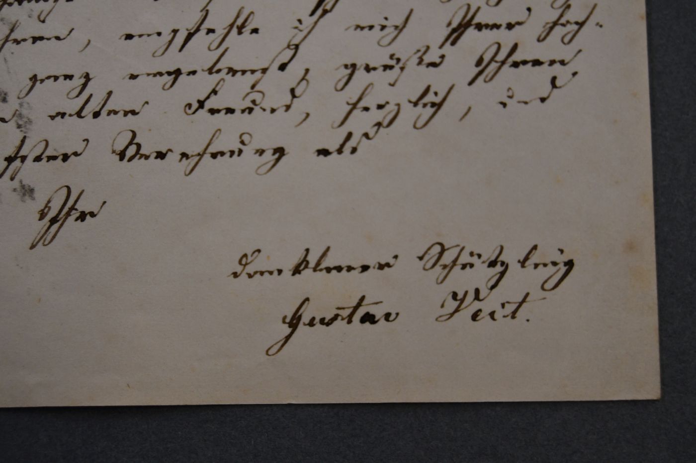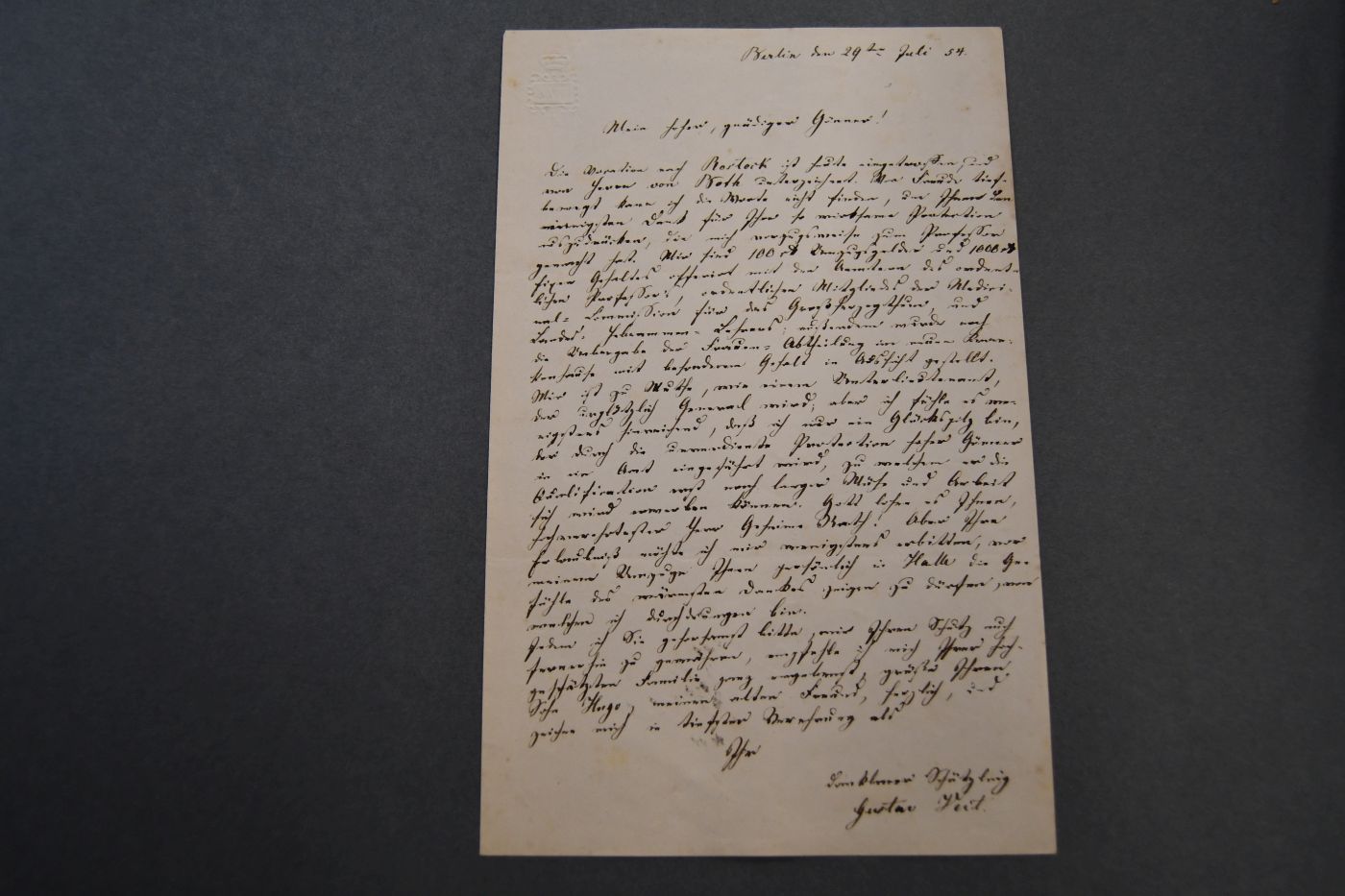 Beschreibung Einseitiger Brief auf einem Doppelbogen mit dem Prägestempel "Bath" von Gustav Veit an Ludwig Pernice in dem er sich für die Unterstützung bei der Berufung auf seinen ersten Lehrstuhl in Rostock bedankt: "... Die Vocation nach Rostock ist heute eingetroffen, und von Herrn von Roth (wohl Paul von Roth (1820-1892) unterzeichnet. Vor Freude tief bewegt kann ich die Worte nicht finden, um Ihnen den ... Dank für Ihre so wirksame Protection auszudrücken, die mich vorzugsweise zum Professor gemacht hat. Mir sind 100 Mark Umzugsgelder und 1000 Mark fixen Gehaltes offeriert mit den Aemtern des ordentlichen Professors, ordentlichen Mitglieds der Medicinal-Commission für das Großherzogthum, und Landes-Hebammen-Lehrers; außerdem wurde noch die Uebergabe der Frauen-Abtheilung im neuen Krankenhause mit besonderem Gehalt in Aussicht gestellt. Mir ist zu Muthe, wie einem Unterlieutenant, der urplötzlich General wird; aber ich fühle es wenigstens hinreichend, daß ich nur ein Glückspilz bin, der durch die unverdiente Protection hoher Gönner in ein Amt eingeführt wird, zu welchem er die Qualification erst nach langer Mühe und Arbeit sich wird erwerben können. Gott lohne es Ihnen, hochverehrtester Herr Geheim Rath! Aber Ihre Erlaubniß möchte ich mir wenigstens erbitten, vor meinem Umzuge Ihnen persönlich in Halle die Gefühle des wärmsten Dankes zeigen zu dürfen, von welchem ich durchdrungen bin. Indem ich Sie gehorsamst bitte, mir Ihren Schutz auch fernerhin zu gewähren, empfehle ich mich Ihrer hochgeschätzten Familie ganz ergebenst, grüße Ihren Sohn Hugo, meinen alten Freund, herzlich, und zeichne mich in tiefster Verehrung als ...".