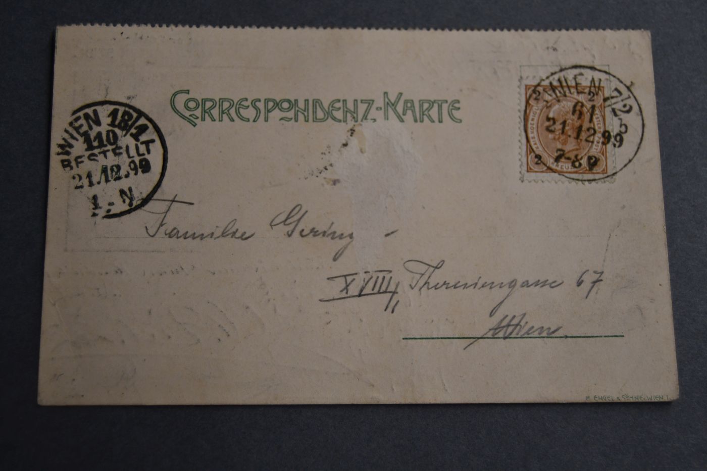 Beschreibung Berieben und bestoßen. Auf der Adressseite mit Lösespur. Adressiert an eine Familie Gering, Wien, Theresiengasse 67.