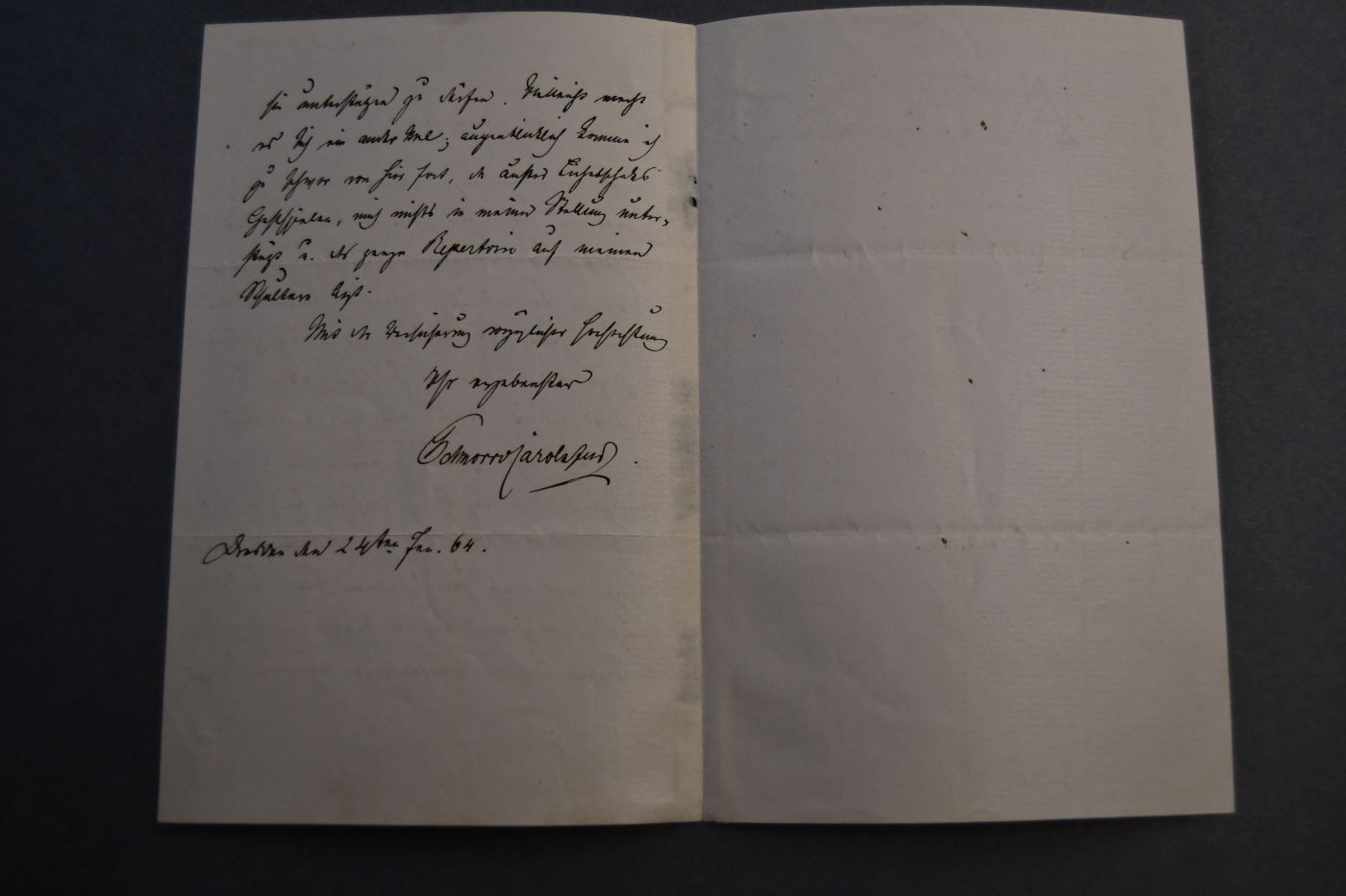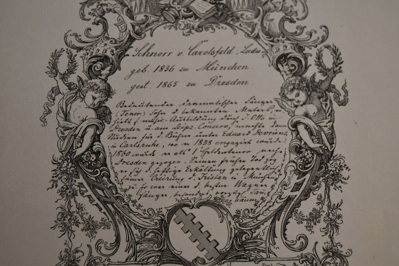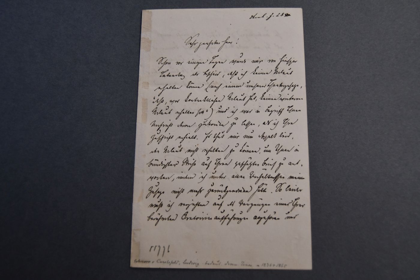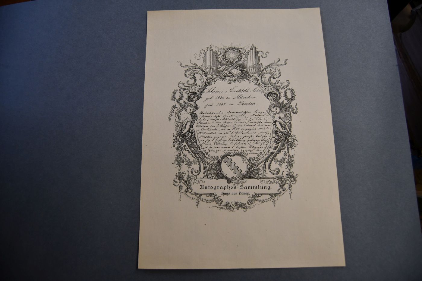 Beschreibung Am Falz alte Montagespuren mit etwas Verlust. Durchgehende Längsfalze. Ludwig Schnorr von Carolsfeld teilt mit, dass er in Dresden keinen Urlaub erhält und: "... So leider muß ich verzichten auf das Vergnügen einer Ihrer berühmten Oratorienaufführungen angehören und sie unterstützen zu dürfen. Vielleicht macht es sich ein ander Mal ...". Ludwig Schnorr von Carolsfeld sang die Partie des Tristan in der Uraufführung des Werkes am 10. Juni 1865. "Sechs Wochen und drei Aufführungen des Tristan später war Ludwig Schnorr von Carolsfeld tot. Plötzlich und völlig unerwartet war er mit gerade erst 29 Jahren in Dresden gestorben. Sein früher und mysteriöser Tod machte ihn zur Legende – und wurde lange als Folge der riesigen Anstrengungen angesehen, die Wagner seinen Sängern, und insbesondere dem Sänger des Tristan, abverlangte" (Wikipedia). Der Brief stammt aus der Autographen-Sammlung von Hugo von Donop. Beiliegend das von F. Wanderer gestaltete und von K. Oertel gestochene Erfassungsblatt von Hugo von Donop und ein Stahlstichporträt von Ludwig Schnorr von Carolsfeld aus dem Verlag der Baumgärtnerschen Buchhandlung in Leipzig.