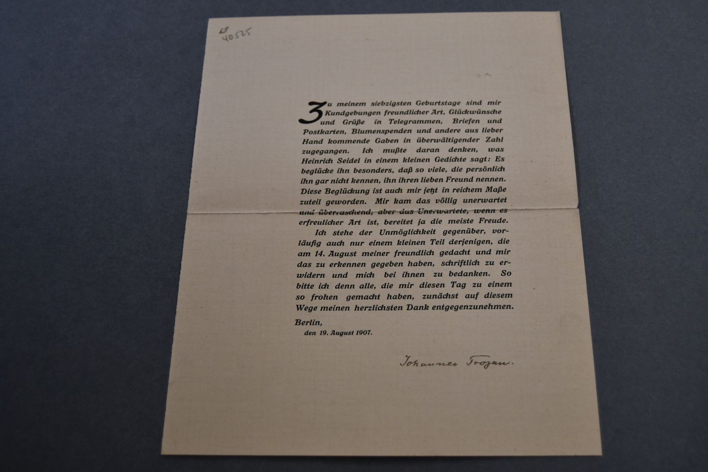 Gedruckte und handschriftlich unterschriebene Dankkarte des Danziger Schriftstellers Johann Trojan (1837-1915) anläßlich seines 70.Geburtstages.