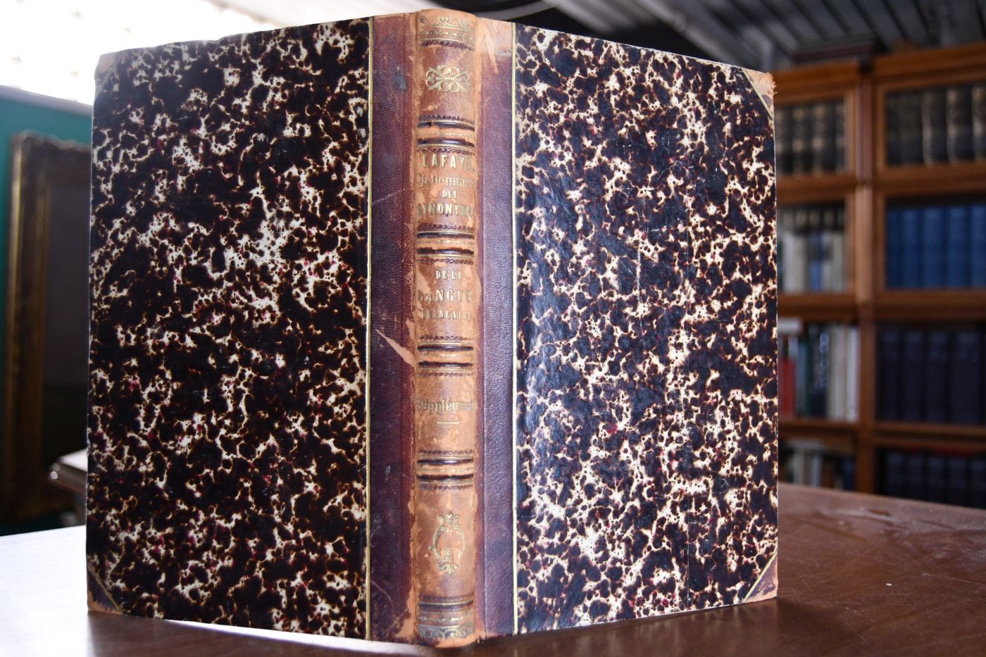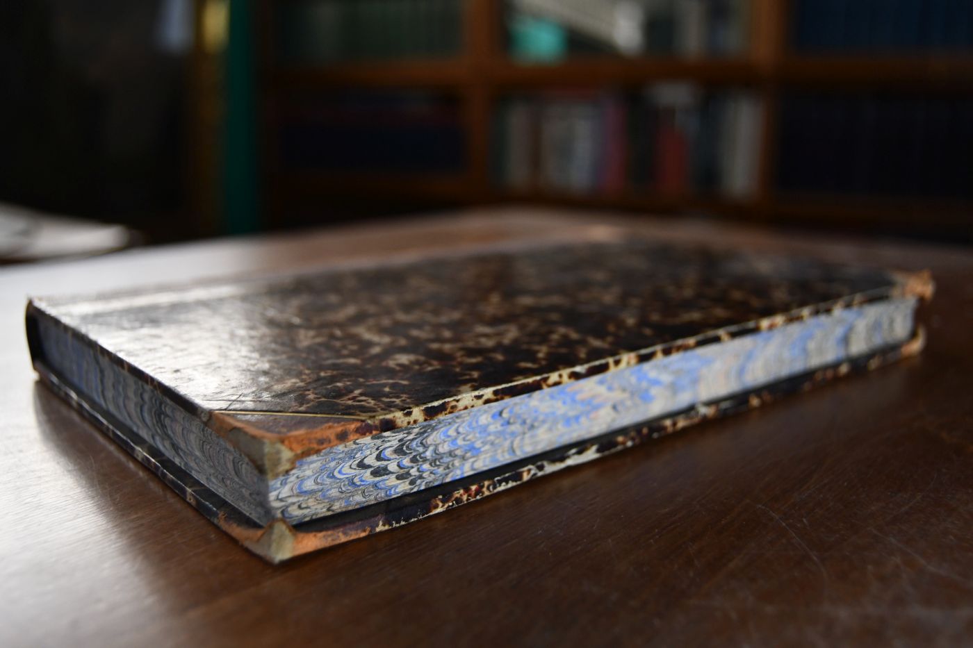 Format 25 x 17 cm, Halbleder mit 4 Bünden und etwas Rückenvergoldung sowie umlaufendem, marmoriertem Farbschnitt