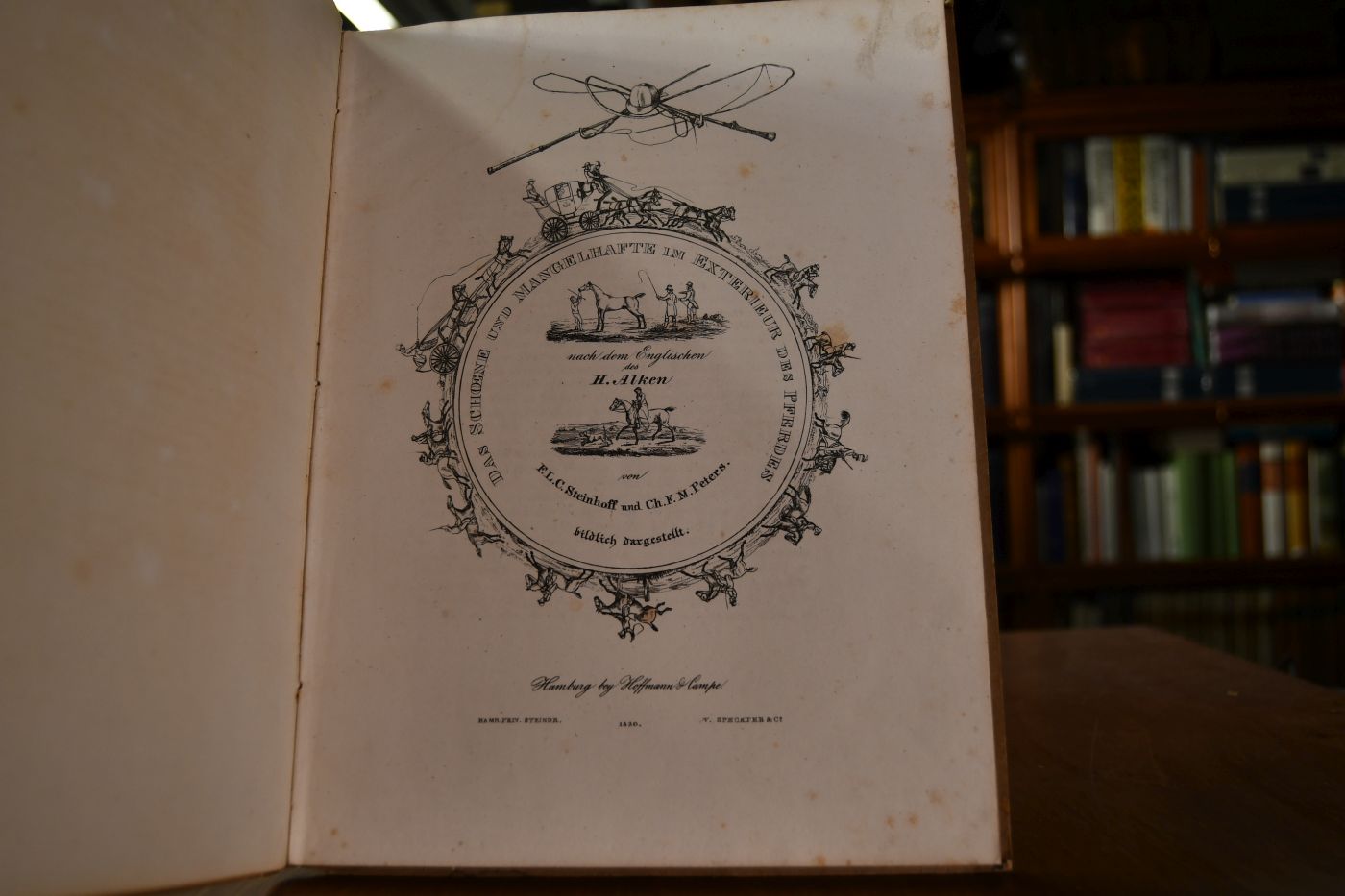 Beschreibung Einband berieben, bestoßen, fleckig, feuchtigkeitsrandig und am Rücken mit etwas Verlust. Handschriftlicher Besitzereintrag (Bauch) auf fliegendem Vorsatz. Durchgehend fleckig und feuchtigkeitsrandig. Huth 85. Zuerst 1817 in London erschienenes Werk des englischen Malers und Graphikers Henry Thomas Alken (1785-1851). Die deutsche Ausgabe besorgte Friedrich Ludwig Carl Steinhoff, Direktor und Professor der Großherzoglich Mecklenburgischen Veterinär-Schule zu Schwerin. Die Tafeln mit schönen Pferdedarstellungen nach Alkens Vorlagen, lithographiert von dem früh verstorbenen Tiermaler Christian F. M. Peters (1808-1830) aus Ludwigslust.