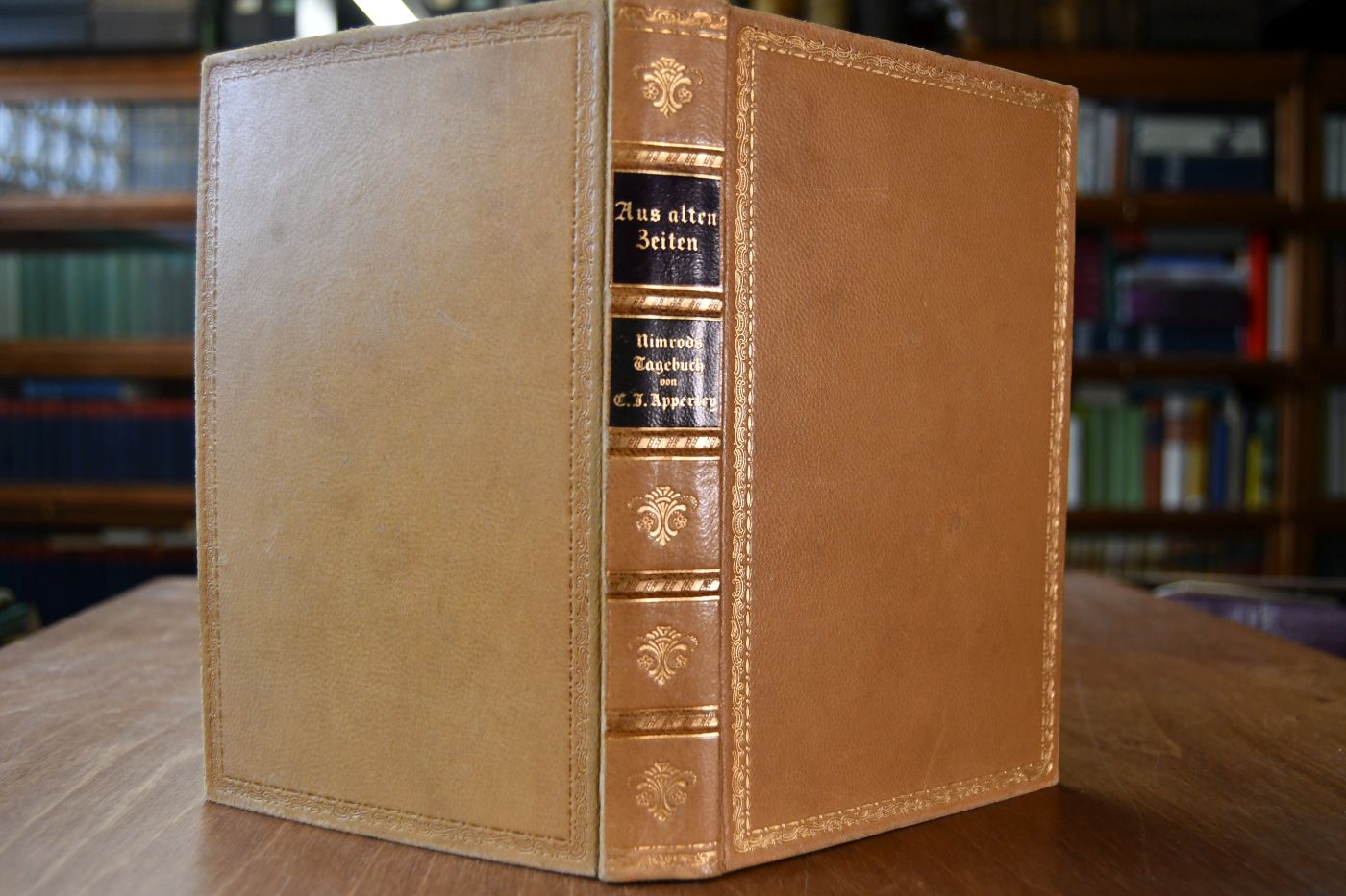 Format 21 x 13 cm, unbeschnittenes Leder mit 2 Rückenschilden und Kopfgoldschnitt