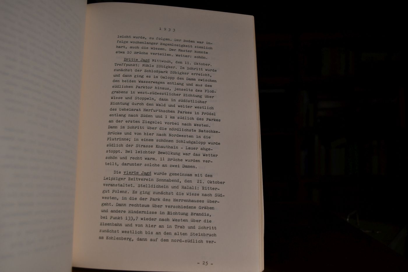 Auszüge aus der Original-Chronik 1930-1945 des Jagdrenn-Club Leipzig - gegründet 9.11.1871 - ausgefertigt für unseren Ehren-Senior Herrn Herbert Thieme Präsident 1911-1945, Master 1911-1939 überreicht anläßlich seines 90. Geburtstages am 19. März 1973 in Baden-Baden. Die Vertrauten (früher Leipzig) e.V.