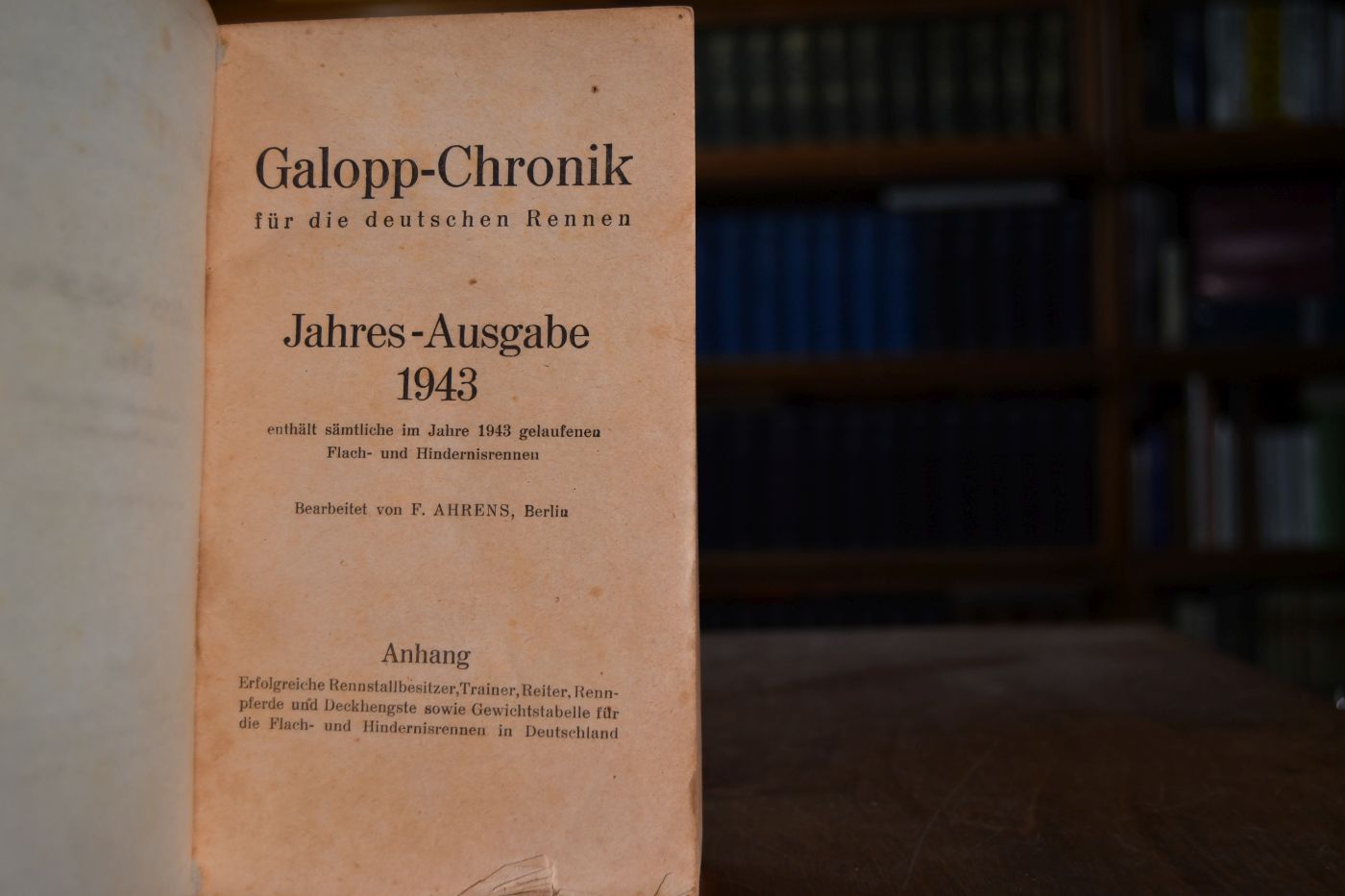 Galopp-Chronik für die deutschen Rennen. Jahres-Ausgabe 1943, enthält sämtliche im Jahre 1943 gelaufenen Flach- und Hindernisrennen.