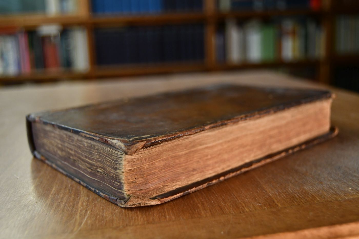 Format 20 x 14 cm, am Rücken erneuerter Lederband auf 5 Bünden mit neuerem Rückenschild