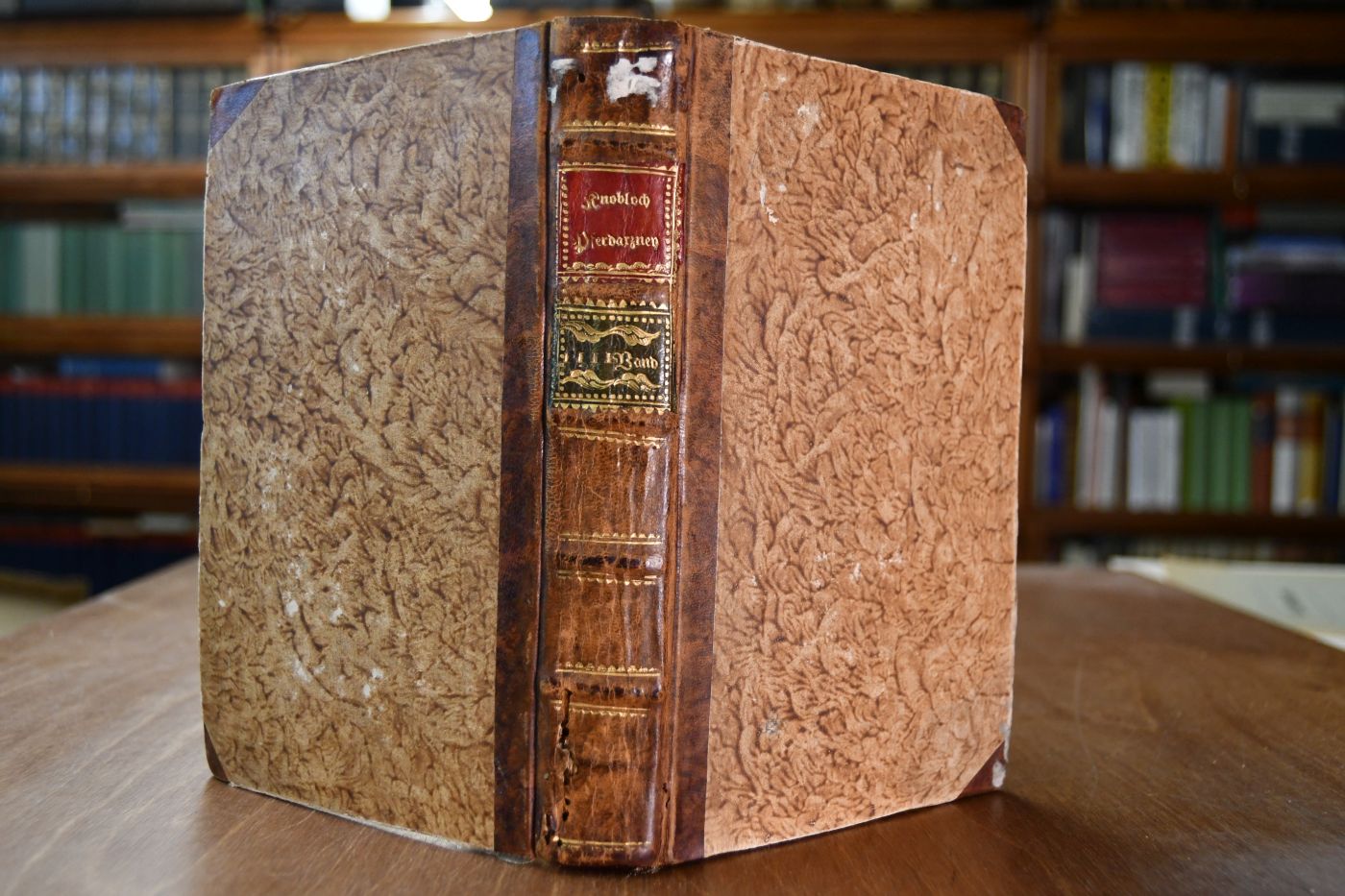 Format 19 x 12 cm, Halbleder der Zeit mit 2 Rückenschilden und umlaufendem Rotschnitt