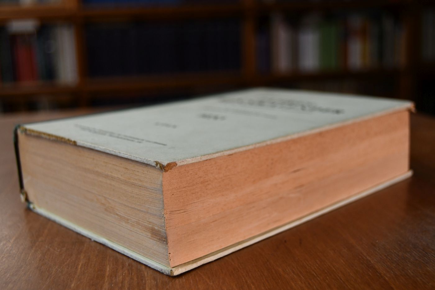 Beschreibung Einband berieben, bestoßen und fleckig. Rücken mit etwas Verlust. Schnitt und innen durchgehend immer wieder fleckig.