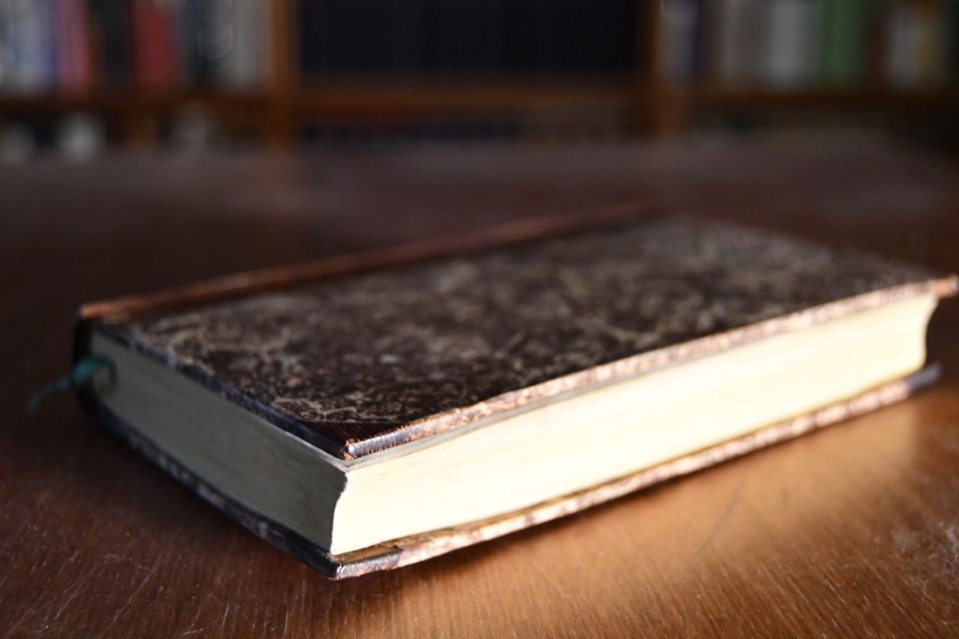 Format 18 x 12 cm, Halbleder der Zeit mit 2 Rückenschilden und umlaufenden Farbschnitt