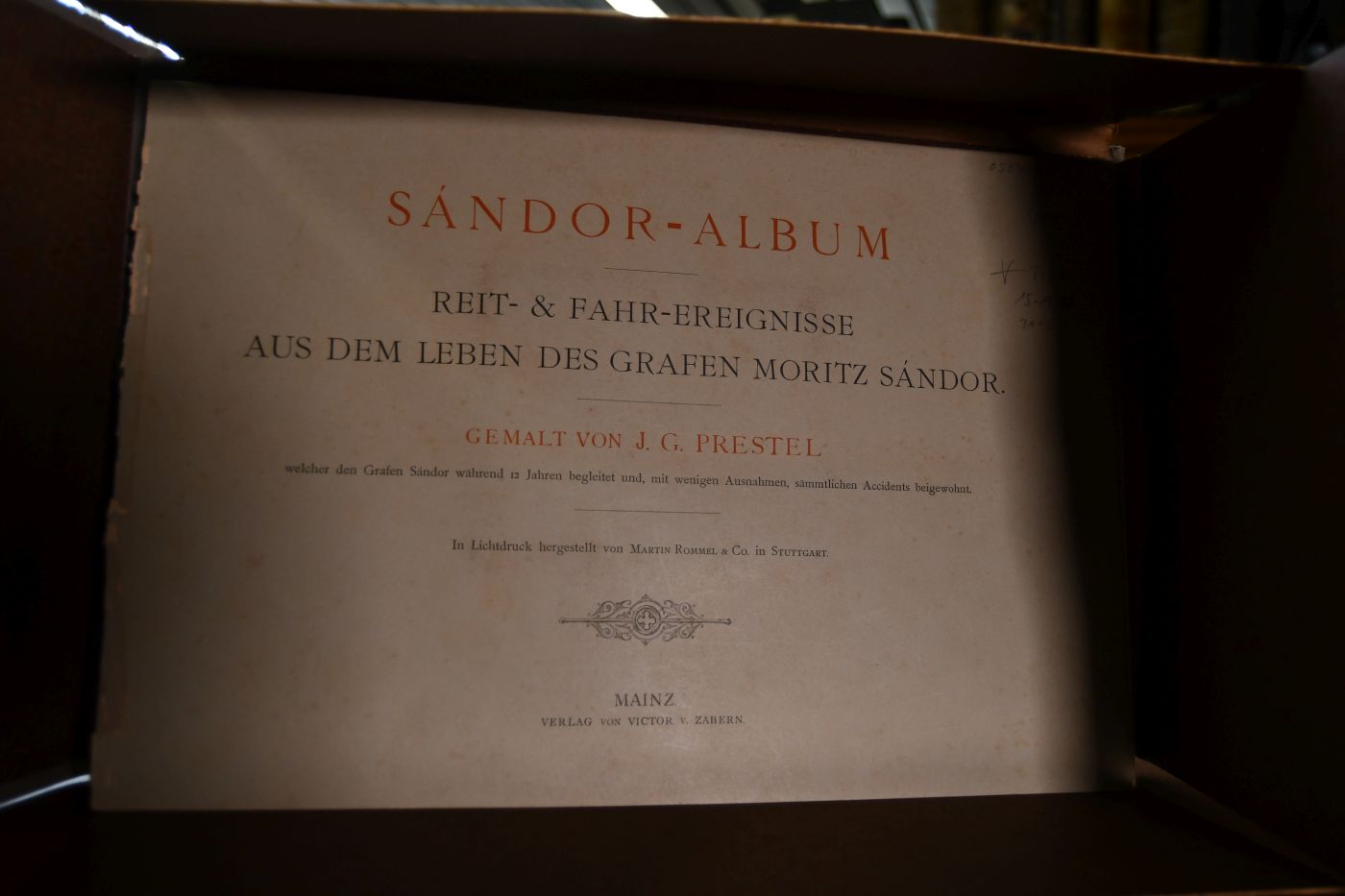 Sandor-Album. Reit- & Fahr-Ereignisse aus dem Leben des Grafen Moritz Sandor. Gemalt von J.G. Prestel welcher den Grafen Sandor während 12 Jahren begleitet und, mit wenigen Ausnahmen, sämmtlichen Accidents beigewohnt. Tafeln 1-14, 20-22, 24-30.