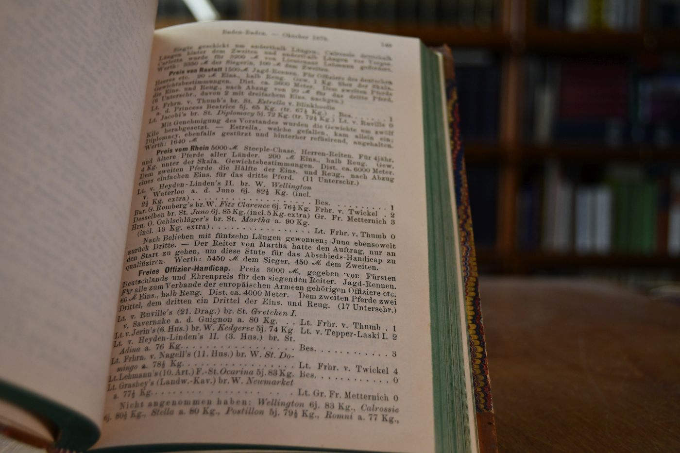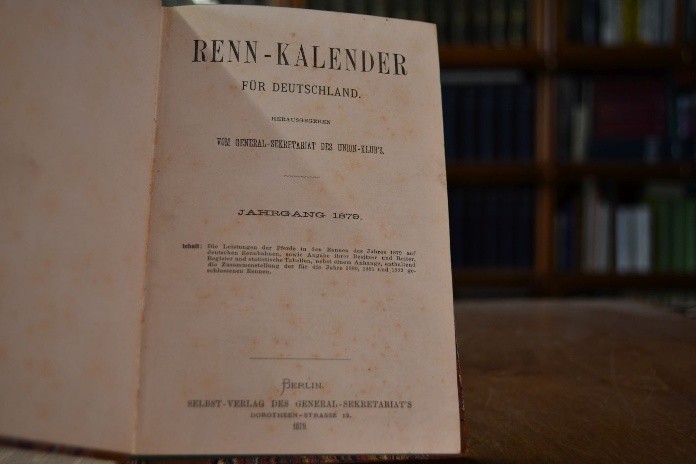 Renn-Kalender für Deutschland herausgegeben vom General-Secretariat des Union-Clubs. Jahrgang 1879. Inhalt Die Leistungen der Pferde in den Rennen des Jahres 1879 auf deutschen Rennbahnen, sowie Angabe ihrer Besitzer und Reiter, Register und statistischen Tabellen nebst einem Anhange, enthaltend die Zusammenstellung der für die Jahre 1880, 1881 und 1882 geschlossenen Rennen.