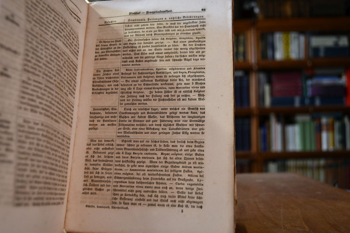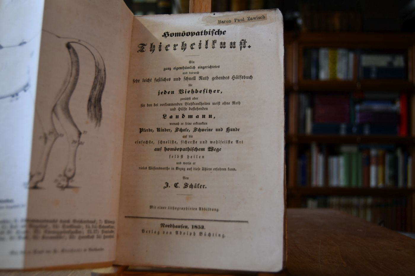 Homöopathische Thierheilkunst. Ein ganz eingenthümlich eingerichtetes und dadurch sehr leicht fasslich und schnell Rath gebendes Hülfsbuch für jeden Viehbesitzer zunächst aber für den bei vorkommenden Viehkrankheiten meist ohne Rath und Hülfe darstehenden Landmann, wonach seine Pferde, Rinder, Schafe, Schweine und Hunde auf die einfachste, schnellste, sicherste und wohlfeilste Art auf homöopathischen Wege selbst heilen und worin er vieles Wissenswerthe in Bezug auf diese Thiere erfahren kann.