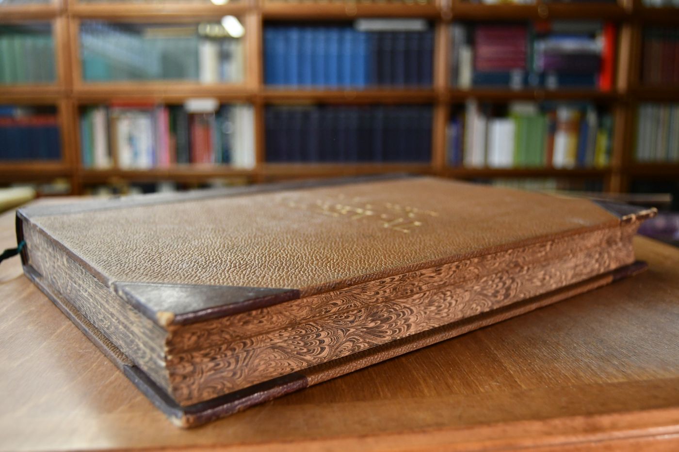 Format 34 x 26 cm, Halbleder auf 5 Bünden mit umlaufendem marmorierten Schnitt