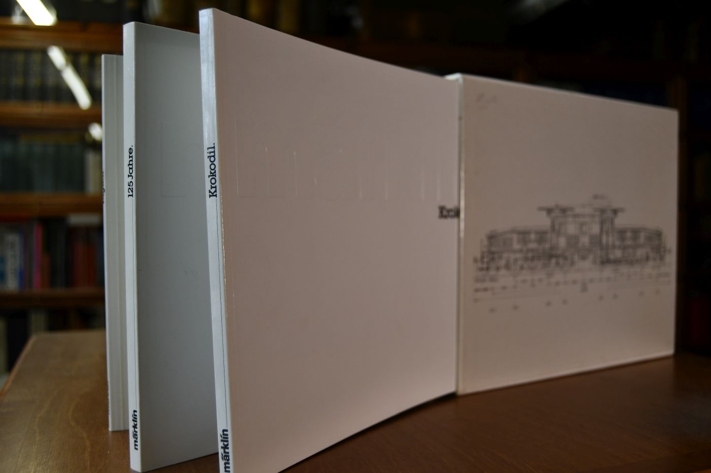 Kasette mit 3 Broschuren 1. H.S. Stammer, Märklin Krokodil, 96 S. 2. Eberhard Nitschke, Märklin, 125 Jahre, 128 S. 3. Peer und Ulrich Blumenschein, Märklin Digital, 80 S.