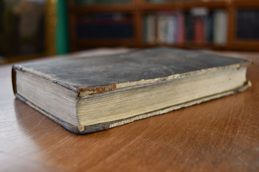 Beschreibung Einband berieben und bestoßen. Angeschmutzt. Bibliotheksexemplar mit einem Aussonderungsstempel auf dem Innendeckel. Handschriftlicher Besitzereintrag (Pfarrei Höfingen 1889) auf dem fliegenden Vorsatz. Durchschossen gebunden mit vielen handschriftlichen Notizen sowohl auf den eingebundenen Blättern als auch im Text, wohl von Hand eines Ortspfarrers. Durchgehend angeschmutzt und fleckig.