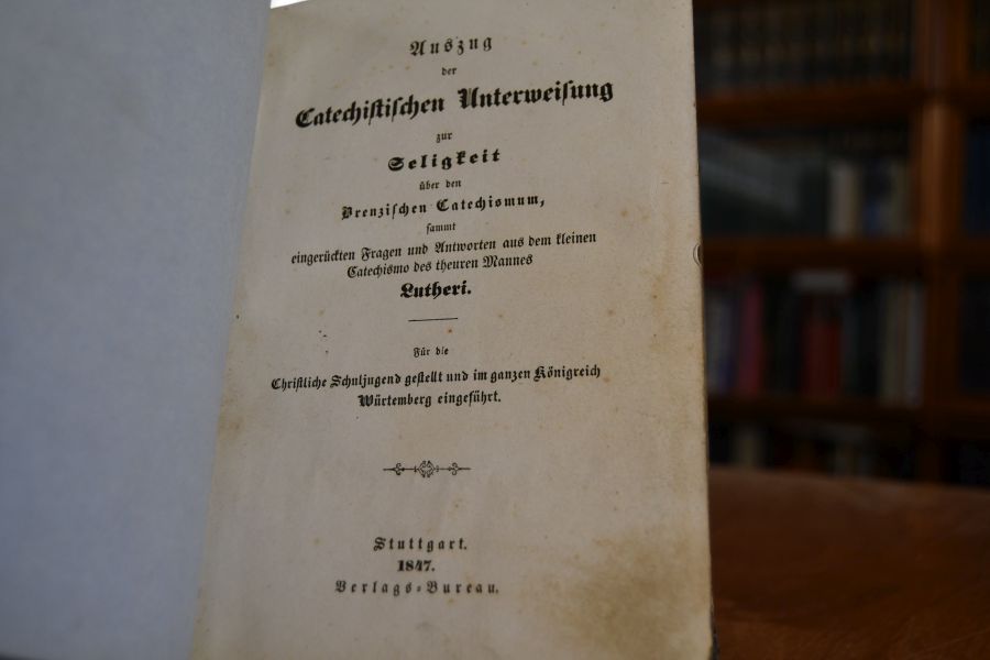 Auszug der Catechistischen Unterweisung zur Seligkeit über den Brenzischen Catechismum, sammt eingerückten Fragen und Antworten aus dem kleinen Catechismo des theuren Mannes Lutheri. Für die Christliche Schul-Jugend gestellt und im ganzen Königreich Würtemberg eingeführt. Beigebunden Evangelischer Unterricht wie die Confirmation, das ist die Taufbundeserneuerung mit der christlichen Jugend vor dem Genuß des heiligen Abendmahls in den gesammten evangelischen Kirchen des Königreichs Württemberg solle vorgenommen werden. Nebst einem Anhang neuer Gebete, Stuttgart, Verlags-Bureau, 1847, 32 S.