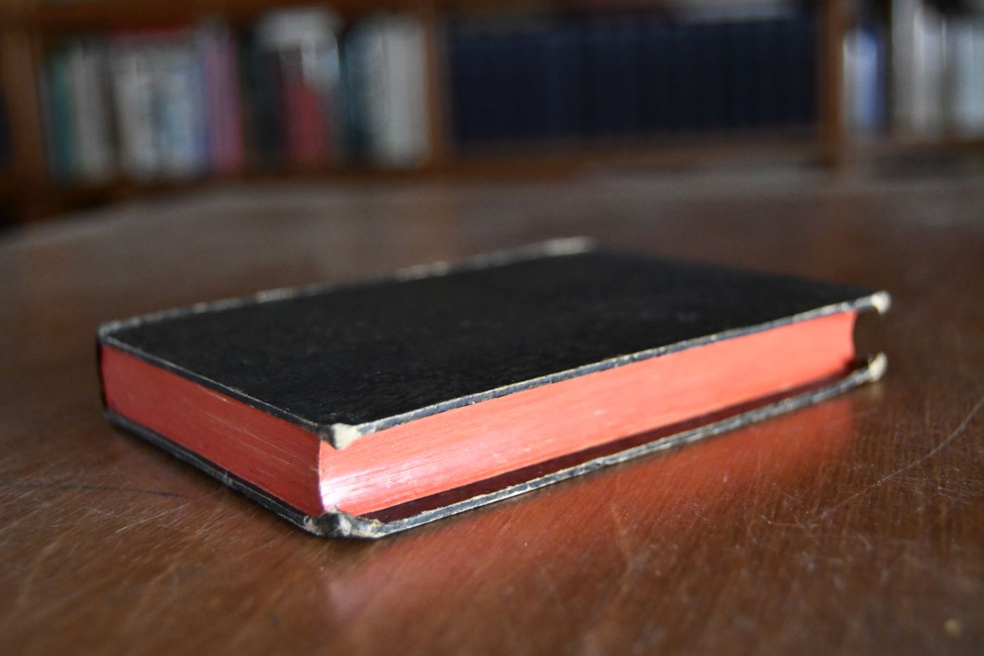 Format 14 x 10 cm, Pappband der Zeit mit Rückenschild und umlaufenden Rotschnitt