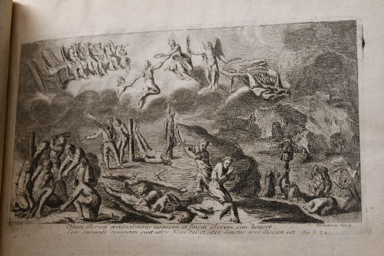 Seiten XXX, 476, XXIII, 400, XXVI, 470, XXXII, 512 Sp.; XXXVI, 416, XXXII, 456, XXXVI, 472, XXVIII, 464 Sp.; 2 Bll, XXVIII, 290, 386, 439 [recte 438], 350, 338 Sp. mit 8 Kupfern von Thomassin.