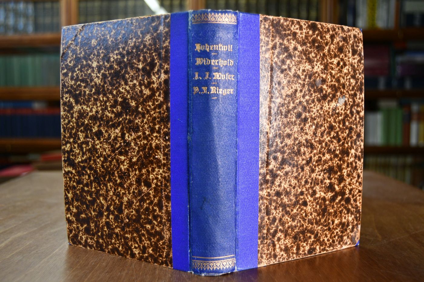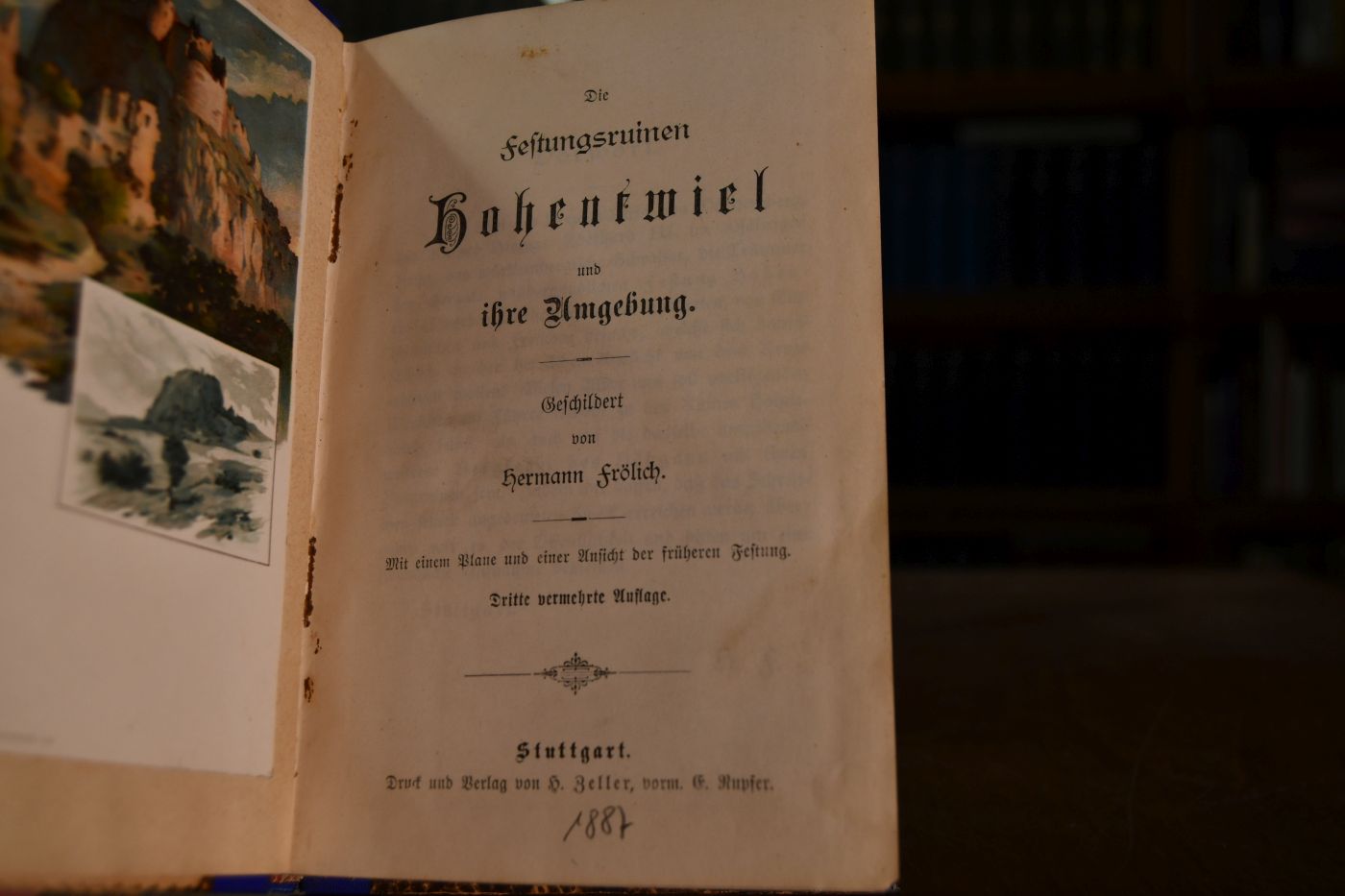 Die Festungsruinen Hohentwiel und ihre Umgebung. Beigebunden 1. O.F.H. Schönhuth, Geschichte der ehemaligen Bergveste Hohentwiel, aus urkundlichen QUellen dargestellt, Tuttlingen, J.F. Bofinger, 1835, XV, 200 S.; 2. J.F. Bahnmaier, Albert Knapp, Gedächtnisfeier Conrad Wiederhold`s, des Vertheidigers von Hohentwiel und Obervogts in Kirchheim, bei der Aufstellung seiner und seiner Gattin Büsten in ihrer Gruftkapelle, den 16. Decbr. 1834, Kirchheim, J.F. Schwarz, 40 S. mit einer Abb. der Büste Wiederholds und der Gruftkapelle in Lithographie; 3. C. Kapff, Jubiläums-Feier zur Erinnerung an die 300. Wiederkehr von Konrad Wiederholds Geburtstag den 20. April 1898, Kirchheim u. Teck, A. Gottlieb sen., 72 S. mit Frontinspiz; 4. Leben des Johann Jakob Moser, Stuttgart, Marriott, [1850], 56 S.; 5. Jahrbuch für christliche Unterhaltung herausgegeben von der Diakonissen-Anstalt zu Kaiserswerth für das Jahr 1869 Der General-Major Philipp Friedrich Rieger oder Wer stolz ist, den kann Gott demüthigen, 49 S., 1868, Verlag der Diakonissen-Anstalt.