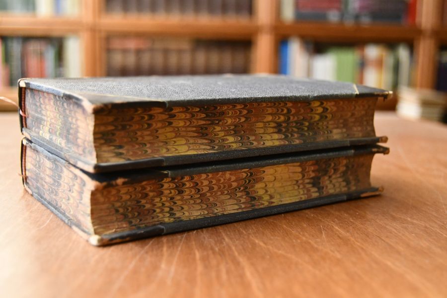 Format 18 x 12 cm, Halbleder mit 4 Bünden, etwas Rückenvergoldung und umlaufendem marmorierten Schnitt