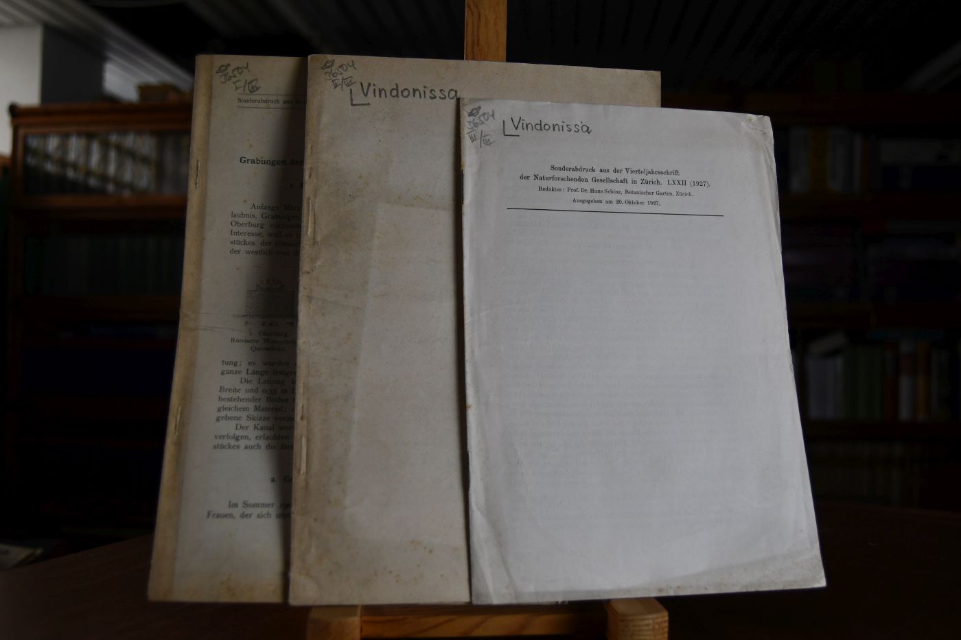 3 Kleinschriften zu Vindonissa. 1. Grabungen der Gesellschaft Pro Vindonissa im Jahre 1906, Sonderabdruck aus dem Anzeiger für schweizerische Altertumskunde N.F., IX. Bd. , 1907. 2. Grabungen der Gesellschaft Pro Vindonissa in den Jahren 1921 und 1922, Sonderabdruck aus dem Anzeiger für schweiz. Altertumskunde 1923, 2. u. 3. Heft. 3. Liste der Pflanzenreste aus dem Kälberhügel Vindonissa von E. Neuweiler. Aus den Mitteilungen aus dem Botanischen Museum der Universität Zürich (CXXIII).