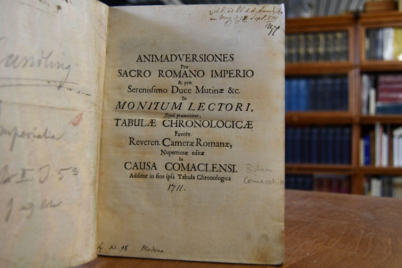 Animadversiones pro Sacro Romano Imperio et pro serenissimo duce Mutinae (etc.) In monitum lectori, quod praemittitur, tabulae chronologicae favore reveren. Camerae Romanae, nuperrimae editae in causa Comaclensi. Additur in fine ipsa Tabula chronologica.
