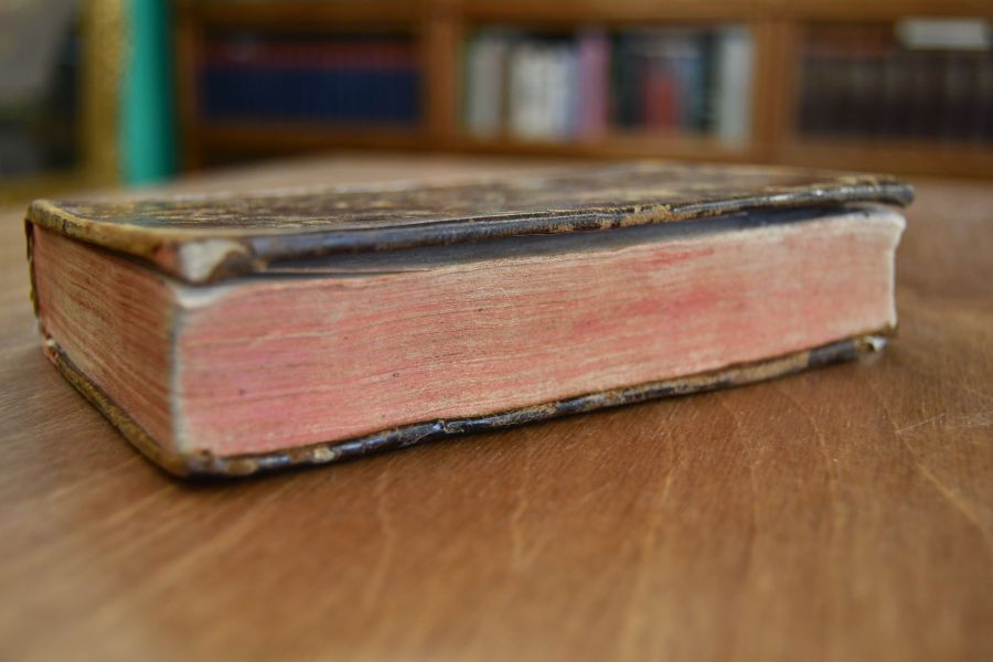 Format 18 x 11 cm, Leder der Zeit mit 5 Bünden, 2 Rückenschilden und Rückenvergoldung sowie umlaufendem Sprengschnitt